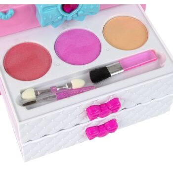 Poleg tega se odpre od zgoraj in po obračanju modre pentlje bo vaš otrok odkril paleto bleščil za ustnice in senčil za oči. Na voljo so 4 barviti bleščila za ustnice in kar 8 senčil za oči, ki bodo na edinstven način poživila vsak obraz.