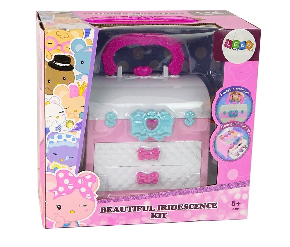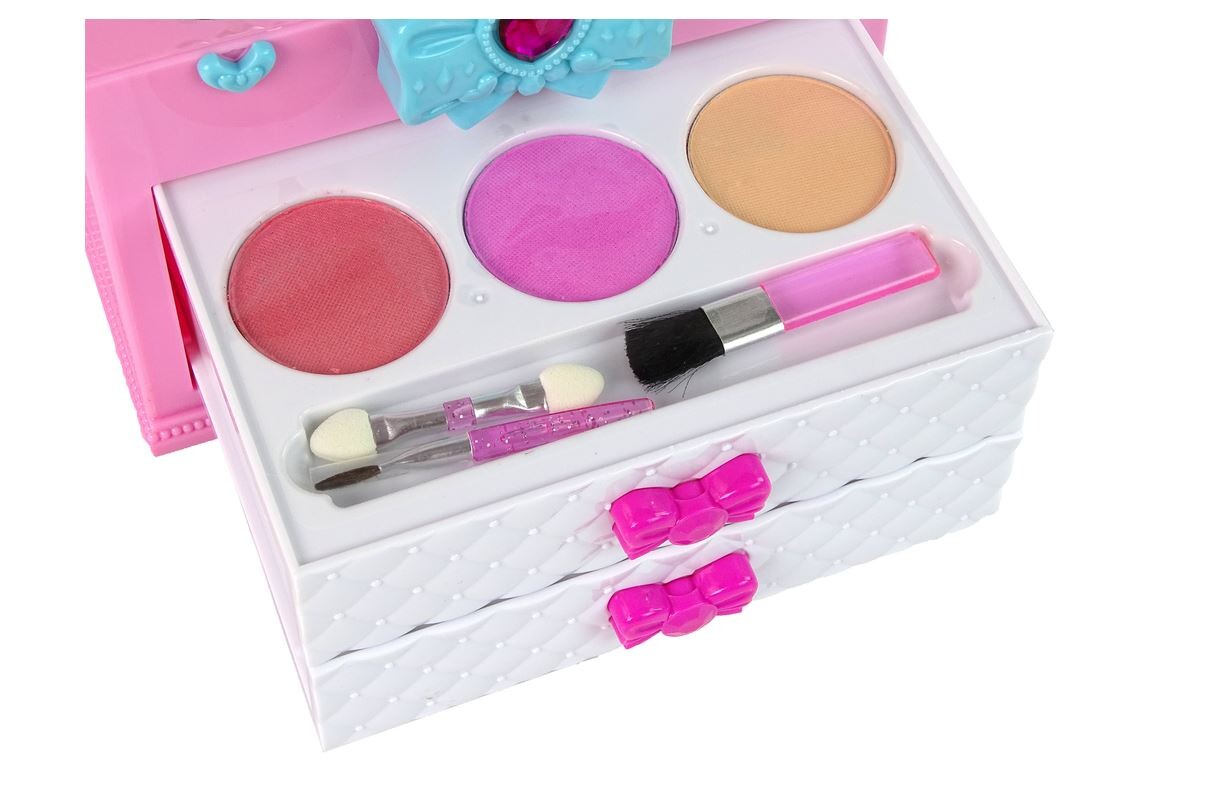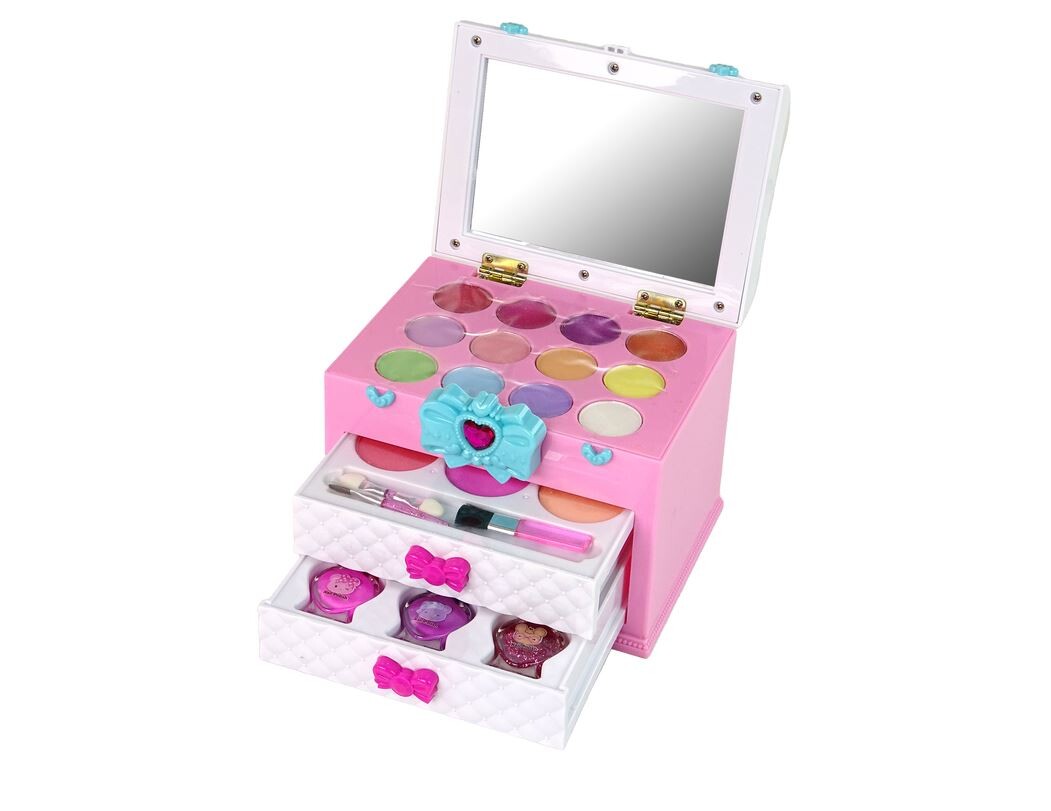 Kovček ima dva drsna predala, ki sta okrašena z nežno roza pentljo, kar celotni stvari daje pridih šarma in dekliškega šarma. Prvi vsebuje 3 senčila za oči in 3 čopiče, ki bodo malim umetnikom omogočili eksperimentiranje z barvami.
