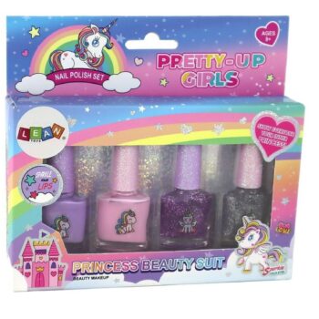 Komplet lakov za nohte Beauty, 4 kosi Podarite svoji mali umetnici nohtov čaroben komplet lakov za nohte, ki jo bo popeljal v svet samorogov. Komplet vsebuje 4 lake za nohte v različnih barvah.