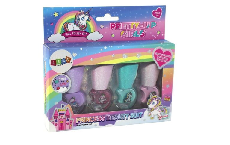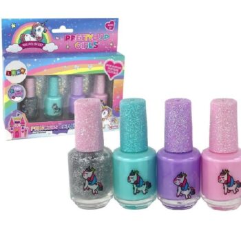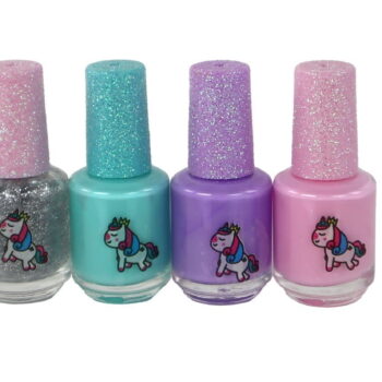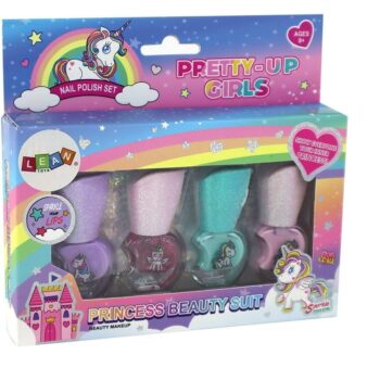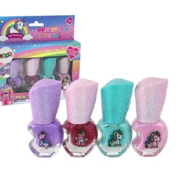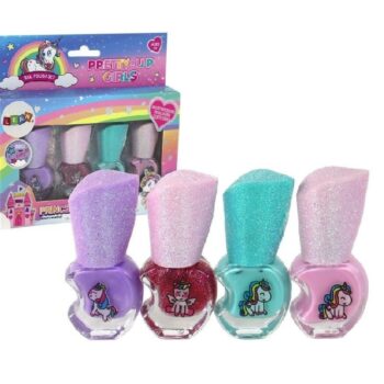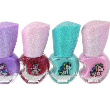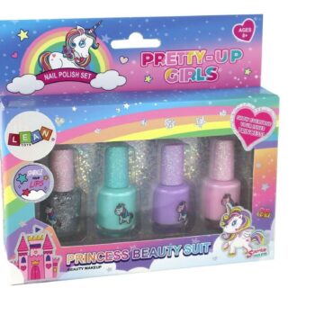 Komplet lakov za nohte Beauty, 4 kosi Podarite svoji mali umetnici nohtov čaroben komplet lakov za nohte, ki jo bo popeljal v svet samorogov. Komplet vsebuje 4 lake za nohte v različnih barvah.