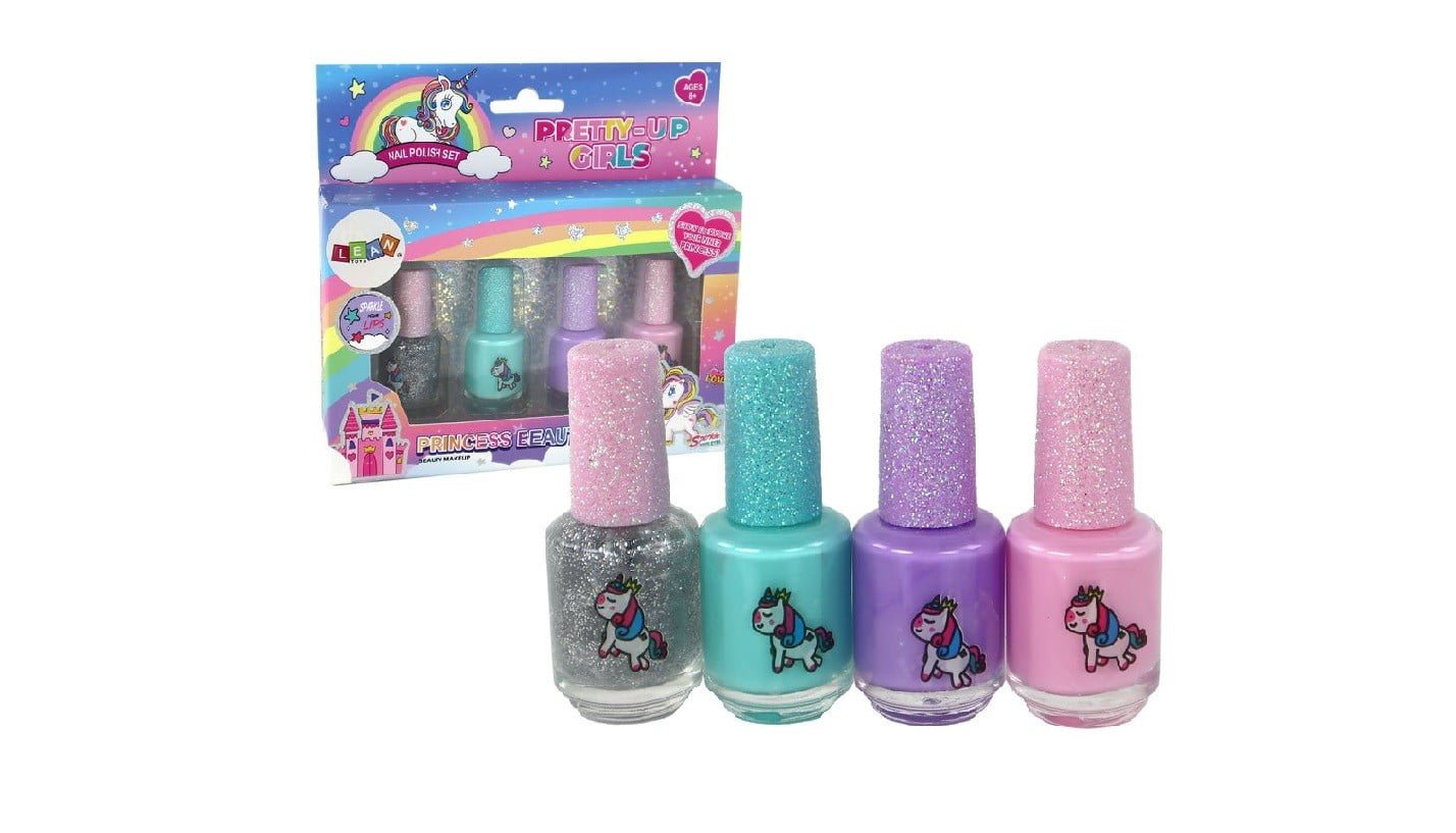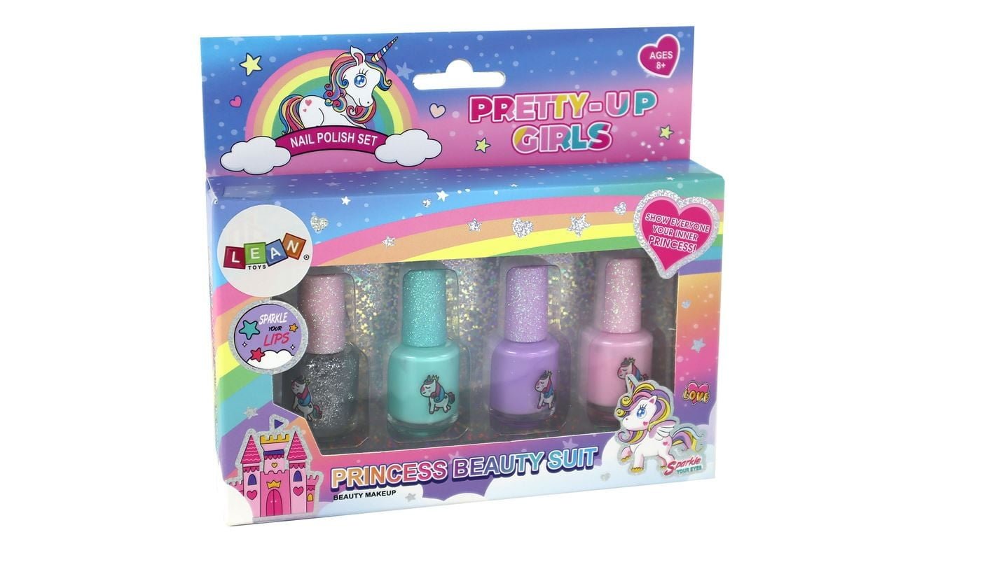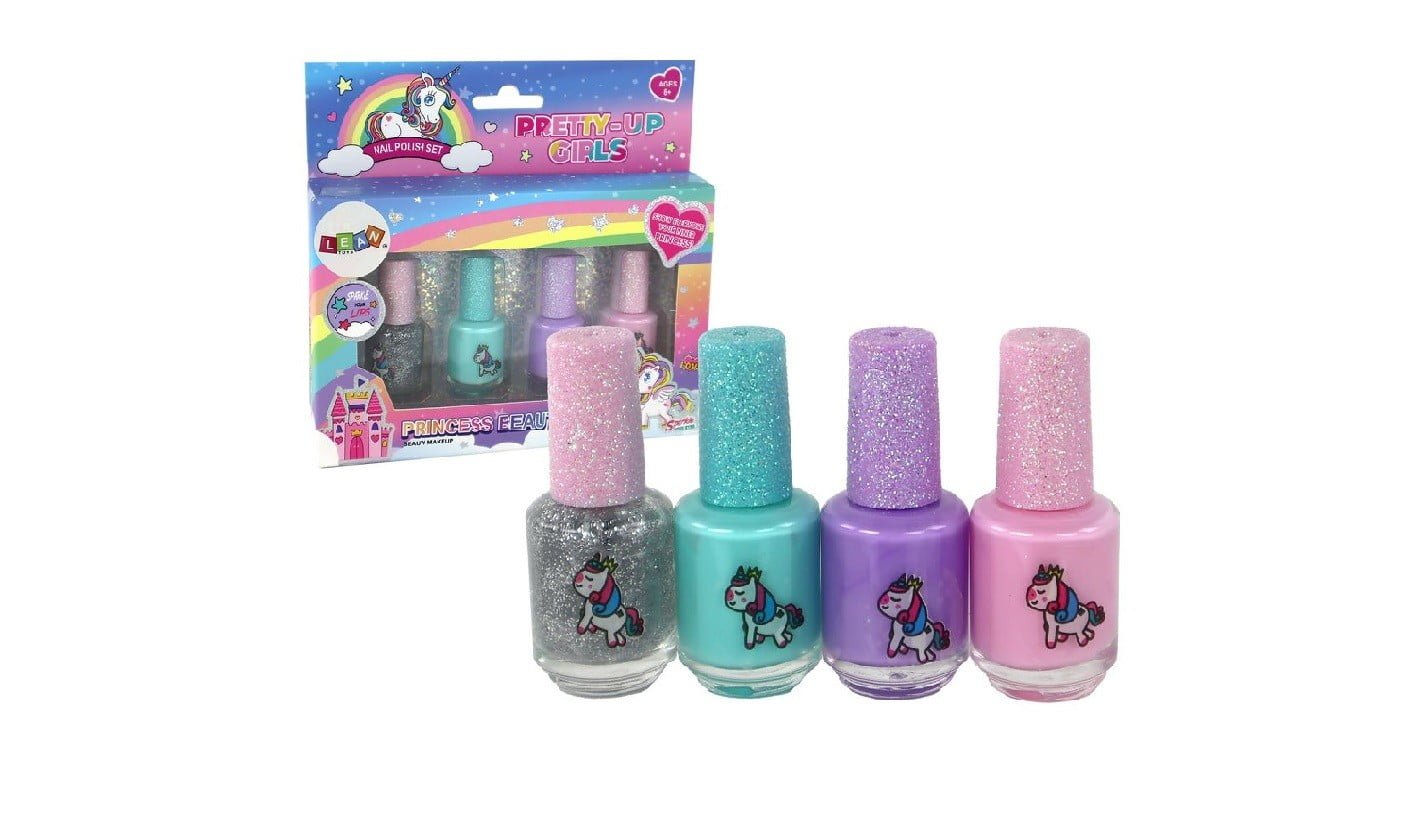 Komplet lakov za nohte Beauty, 4 kosi Podarite svoji mali umetnici nohtov čaroben komplet lakov za nohte, ki jo bo popeljal v svet samorogov. Komplet vsebuje 4 lake za nohte v različnih barvah.