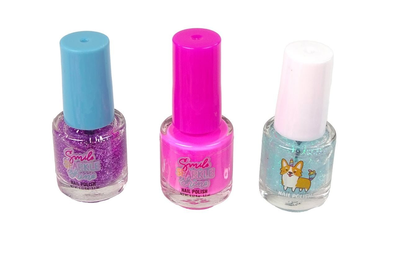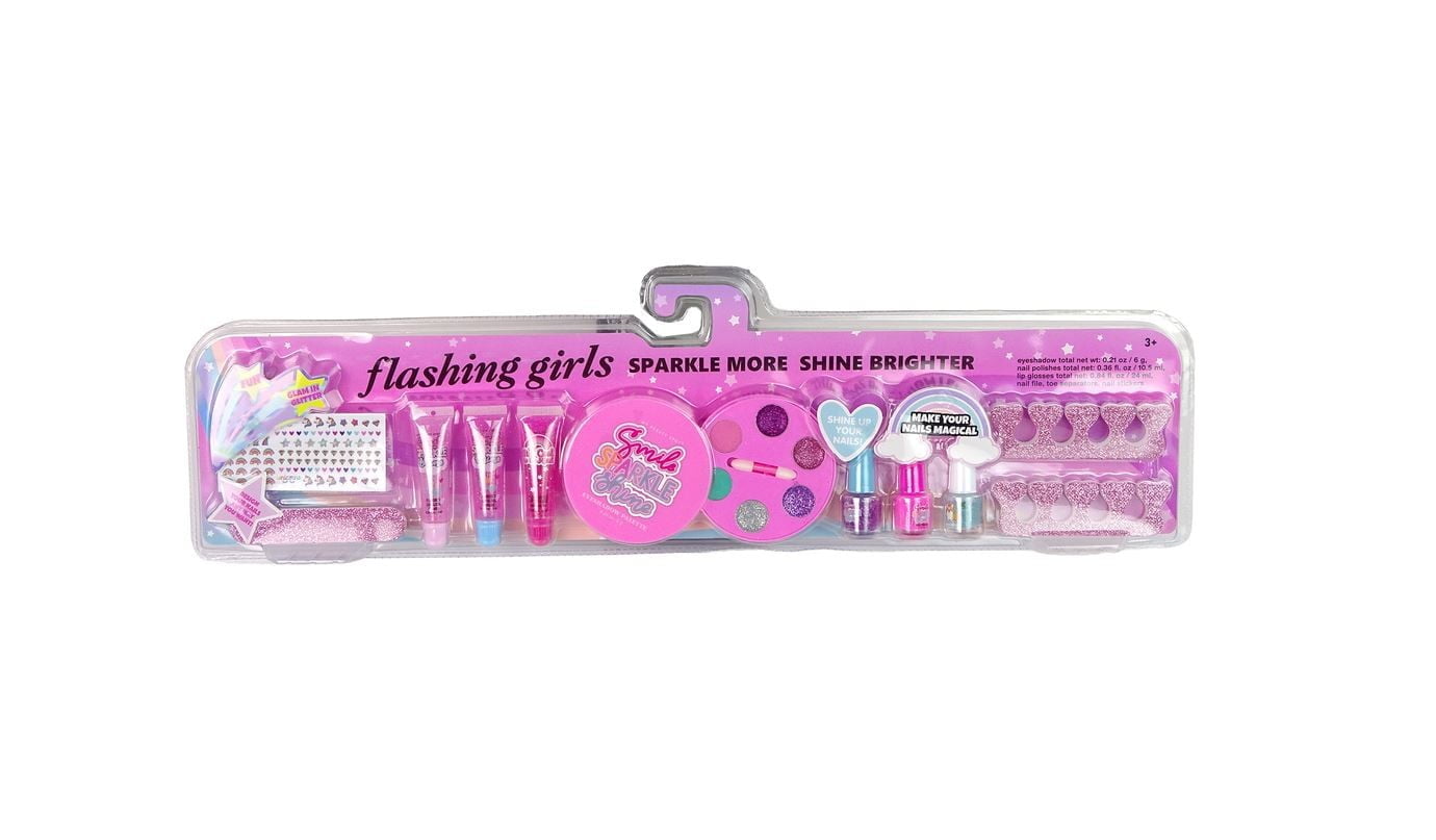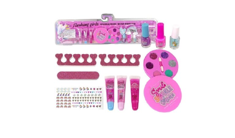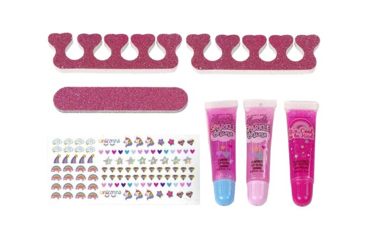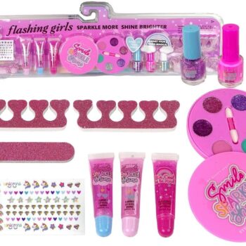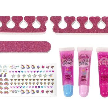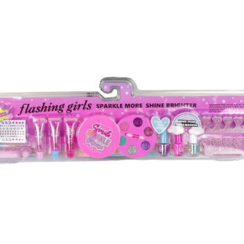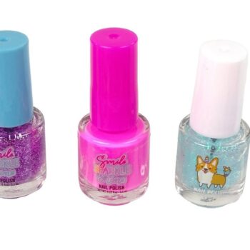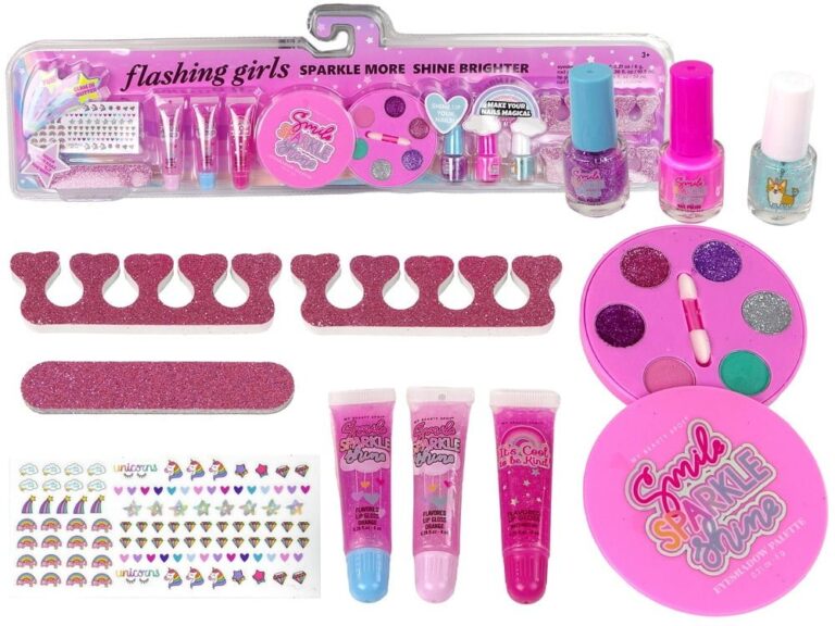 Predstavljamo komplet, ki bo vsaki mladi dami pomagal pri njenem prvem samostojnem ličenju in manikuri. Izrazite se in pokažite svoj stil! Nalepke bodo dodale izvirnost. Barvanje in lepljenje nalepk razvija natančnost in ročne spretnosti. Kako uporabljati lake in druge pripomočke? Po ravnanju dolžine in oblike nohtov s pilo nanesite izbrano barvo laka in nalepk na nohte. Vsi izdelki so varni in hipoalergeni, kar omogoča varno uporabo. Izdelki lepotnega kompleta: – 3 laki za nohte: roza, vijoličen z bleščicami, turkizna z bleščicami – 3 glos za ustnice v različnih odtenkih roza – paleta senčil za oči – 4 bleščeče in 2 običajni barvi – nalepke v različnih dizajnih – ločilo za prste x2 – roza pilica z bleščicami