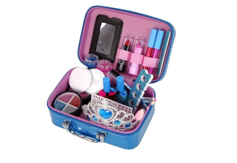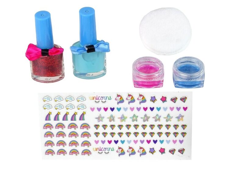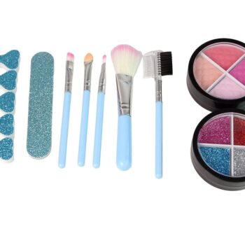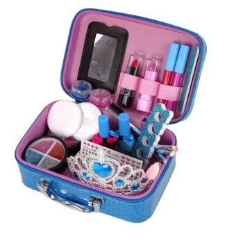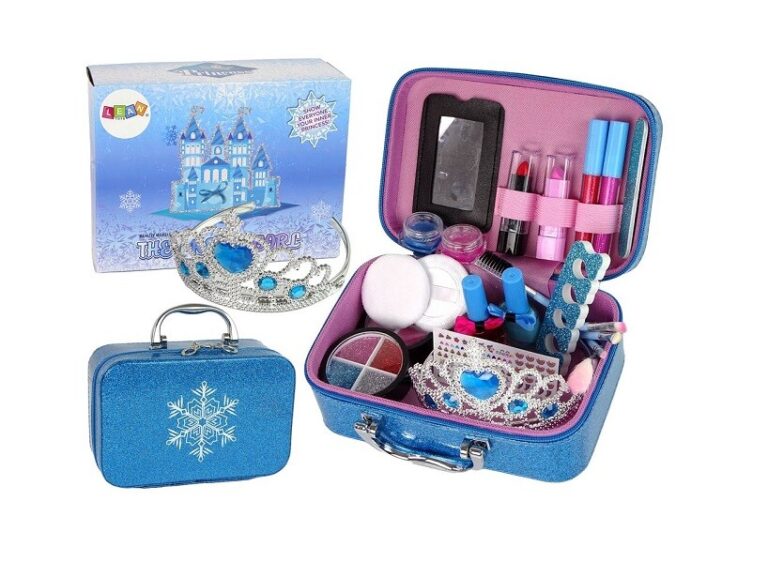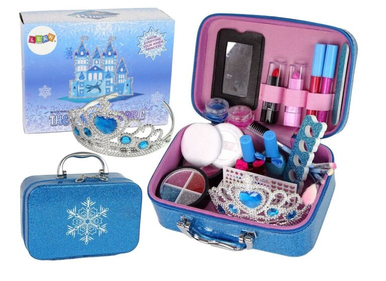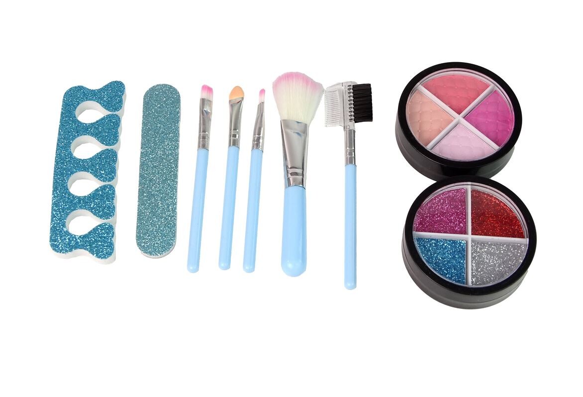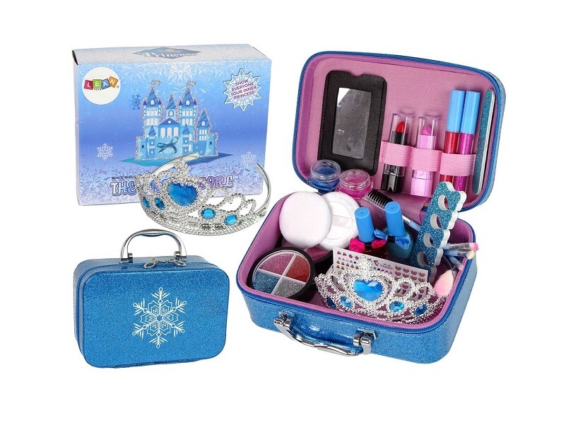 Kozmetika je zasnovana tako, da je varna in neškodljiva za otroke, ter ne vsebuje parabenov. Za odstranitev ličil jih preprosto obrišite s robčkom ali vatno blazinico, z milom in toplo vodo. Komplet vsebuje: – etui z ogledalom – tiaro – 2 šminki: roza, rdeča – 2 glosa: roza, rdeč – 2 laka za nohte: rdeč z bleščicami, moder – okroglo paleto s 4 bleščečimi senčili za oči – okroglo paleto s 4 rdečili za lica – 2 steklenički bleščic: modra, roza – čopiče za ličenje – bleščeč ločilnik za prste – pilica za nohte – nalepka za nohte
