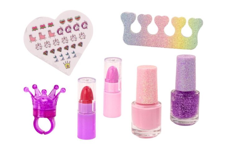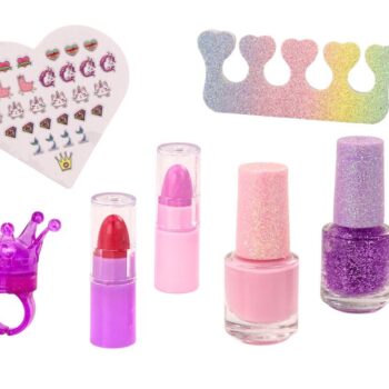 Dajte svojemu otroku priložnost, da na ustvarjalen in varen način odkrije fascinanten svet ličil s tem ljubkim kompletom, ki je na voljo v plišasti vrečki. Vrečka vsebuje: dva laka za nohte, ločilo, nalepke za nohte, čopič za senčilo za oči, dve majhni šminki in čudovit obroč, ki skriva bleščilo za ustnice v obliki krone.