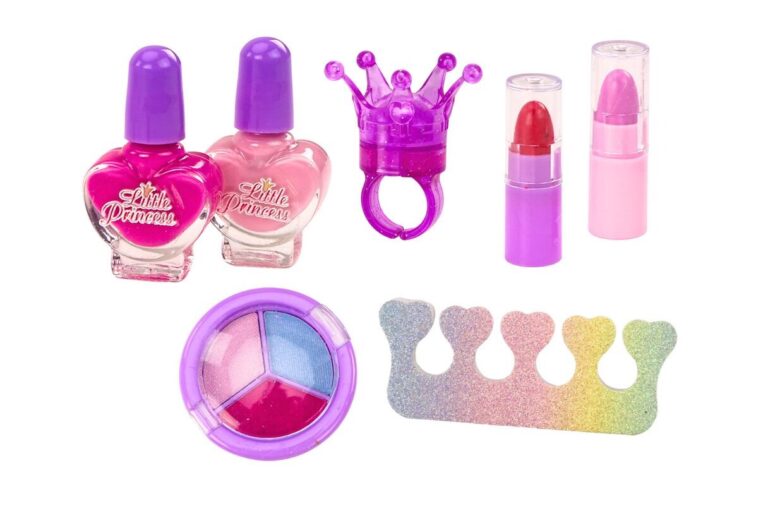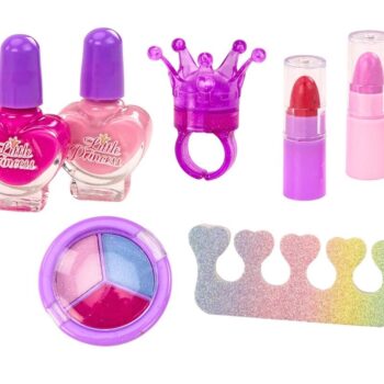 Dajte svojemu otroku priložnost, da na ustvarjalen in varen način odkrije fascinanten svet ličil s tem ljubkim kompletom, ki je na voljo v plišasti vrečki. Vrečka vsebuje: dva laka za nohte v nežnih barvah, ločilo, tri odtenke senčil za oči, čopič za senčila za oči, dve majhni šminki in čudovit obroč, ki skriva bleščilo za ustnice v obliki krone – vse to tvori popoln komplet za zabavno oblikovanje.