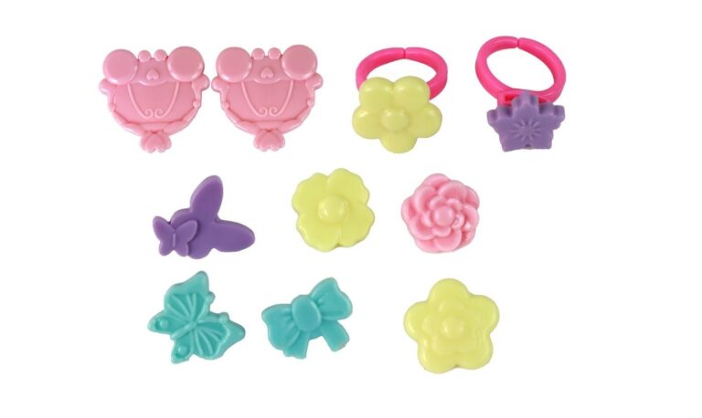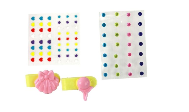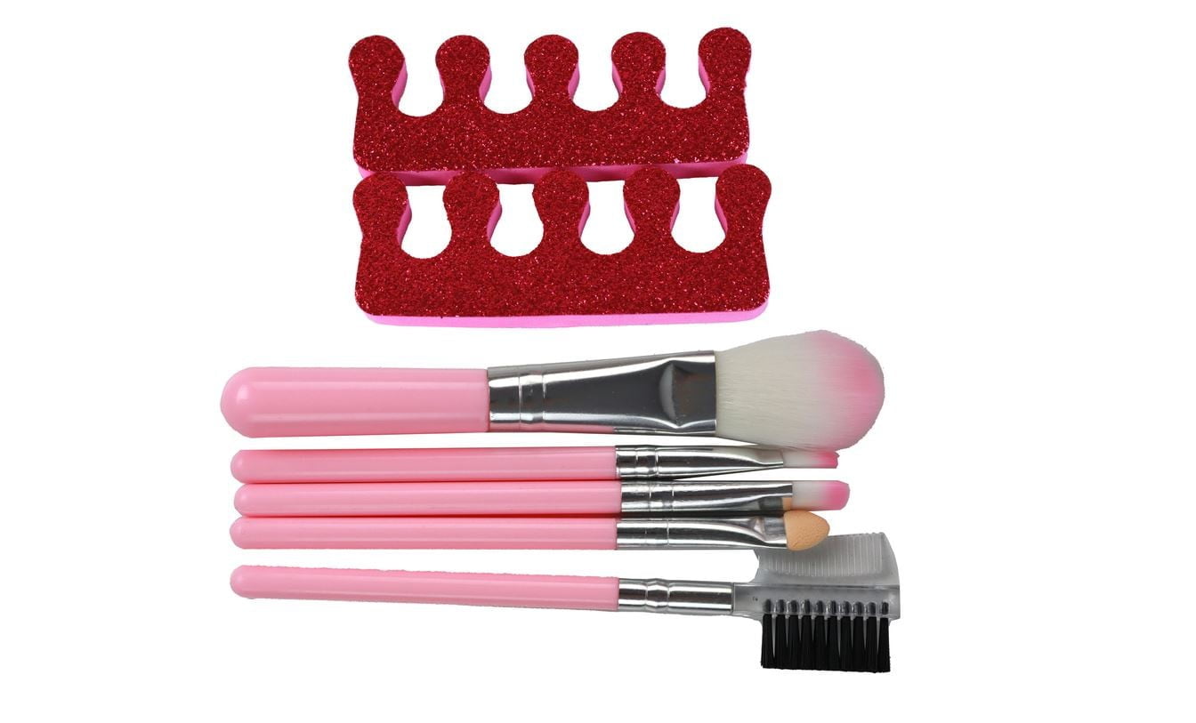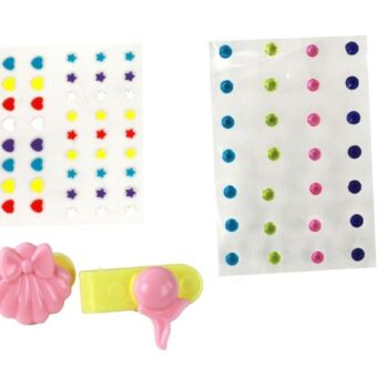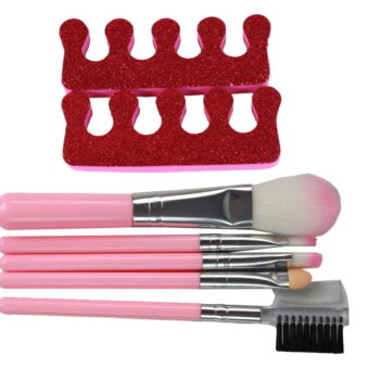 Vsebina kompleta: – torbica – roza čevlji z visoko peto – komplet petih čopičev – dva prstana – dva ločila za nohte – dve roza šminki – tri senčila za veke – dva laka za nohte – dve šminki – dodatki