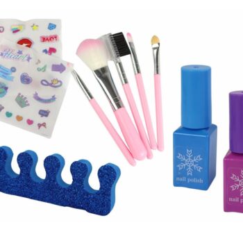 – kovček z ogledalom – paleta s senčilom za oči, glosom in bleščicami – paleta z rdečilom za lica in osvetljevalcem – gloss za ustnice – ločilo za nohte – pilica za nohte – 2 laka za nohte – čopiči za ličenje – nalepke za nohte