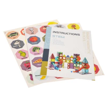 | – strukturni elementi, vključno s 48 magnetnimi elementi, – 8 pisanimi žogicami, – figuri fantka in deklice s premičnimi elementi, – 40 okrasnih nalepk, – ilustrirana navodila za sestavljanje različnih modelov. |