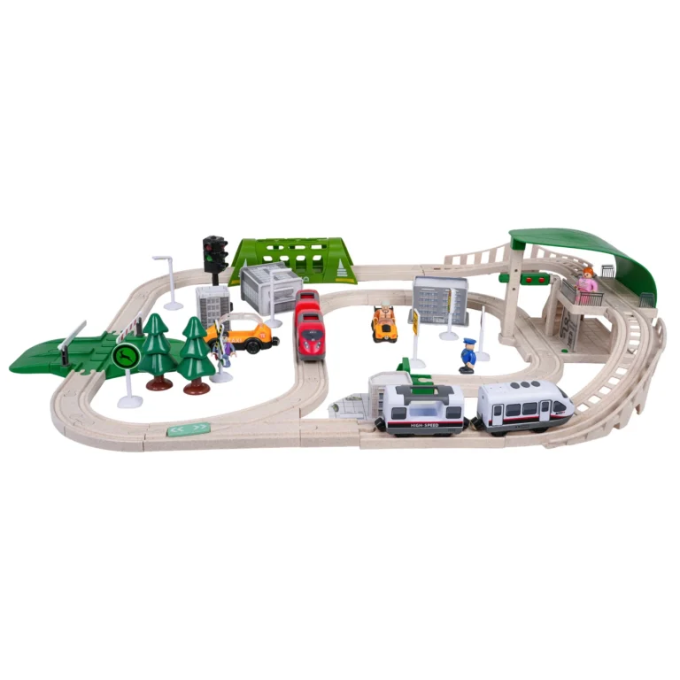 | – elementi za gradnjo tirov + predor, cestne ovire, postajna stavba, mestne zgradbe, – 2 x vlak, – 2 x avto, – 4 x figurice likov, – prometni znaki, – 2 x drevesi, – navodila, – okrasne nalepke. |