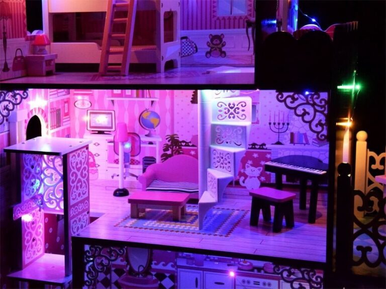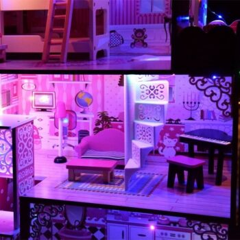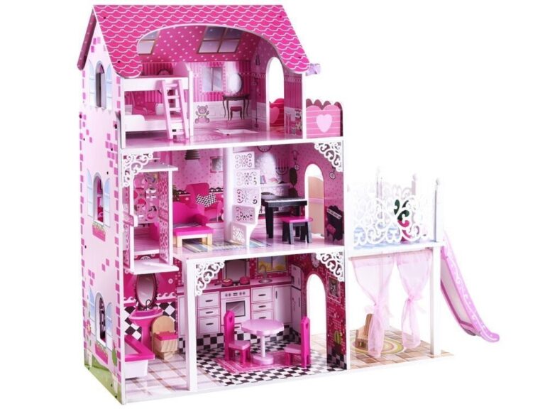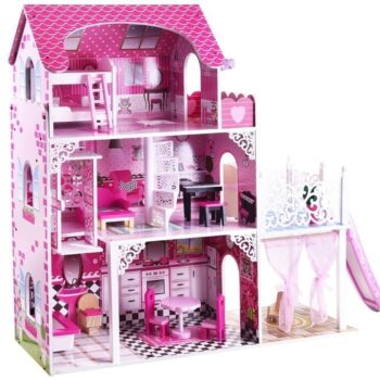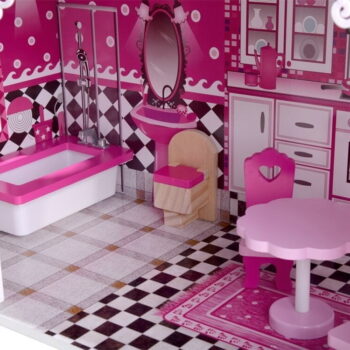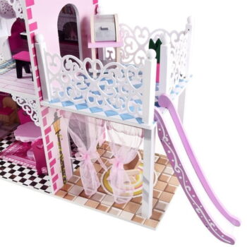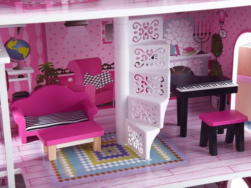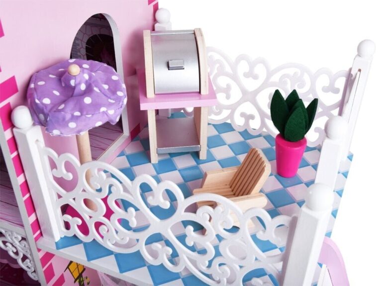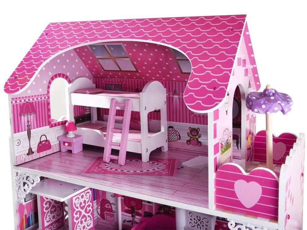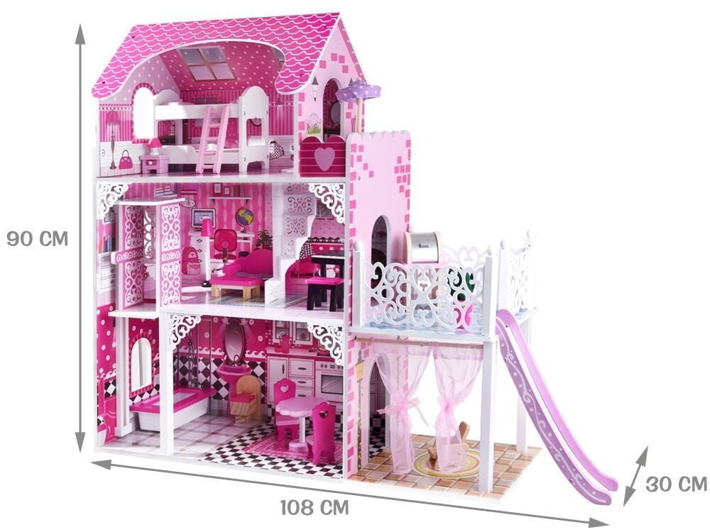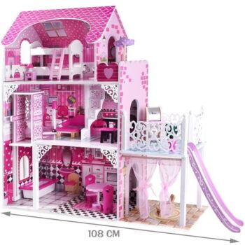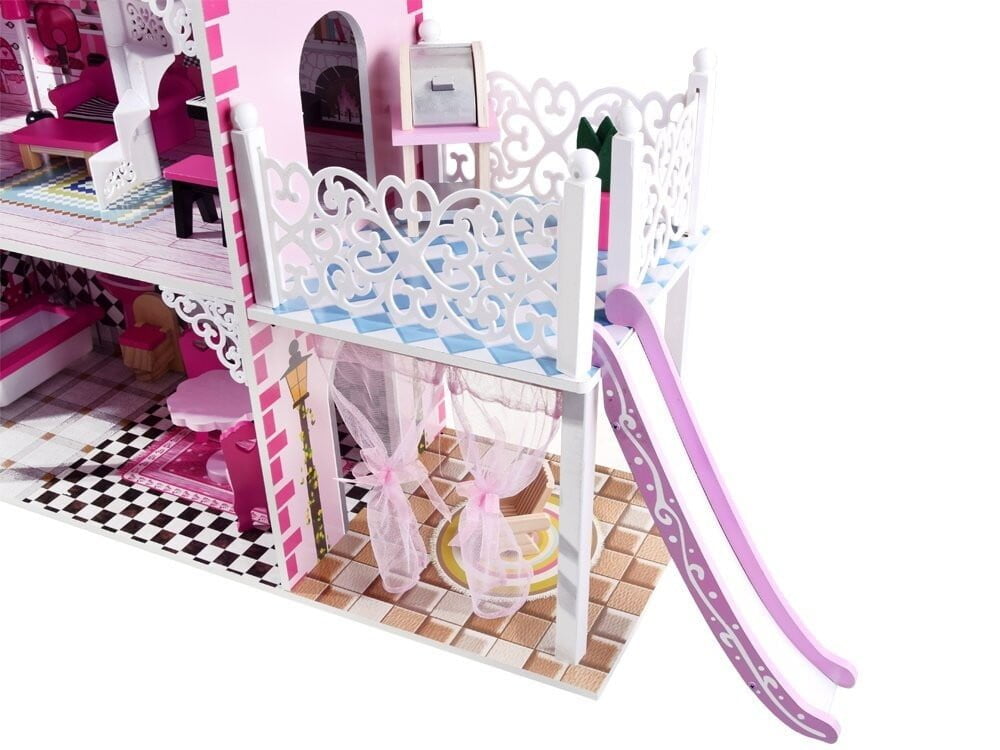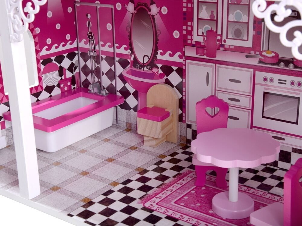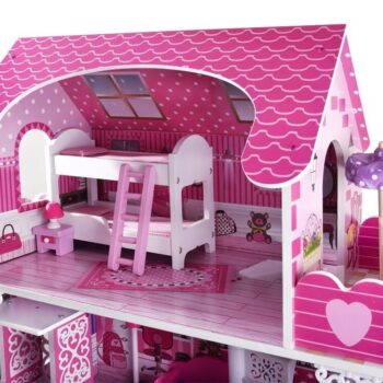 Očarljiva lesena hišica za punčke s pohištvom so sanje vsake deklice. Hiška v neverjetno impresivni grafiki, barvah z odprtimi stopnicami, ograjami in okraski bo zagotovo navdušila novega lastnika te vile. Hiška je opremljena z vsem potrebnim pohištvom, ki je potrebno za njeno delovanje. Dodatna prednost hišice je dvigalo in tisto, kar imajo otroci najraje – tobogan za punčke! Vse punčke