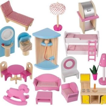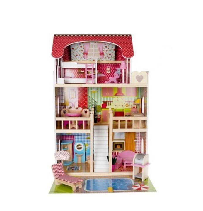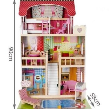 • PROSTORNA – lesena hišica za punčke je zasnovana za družino 4 punčk. Ima 3 nadstropja, povezana s čudovitim belim stopniščem, kar 5 sob + balkon in vrt z bazenom. Vsaka punčka sanja o tako veliki hiši!