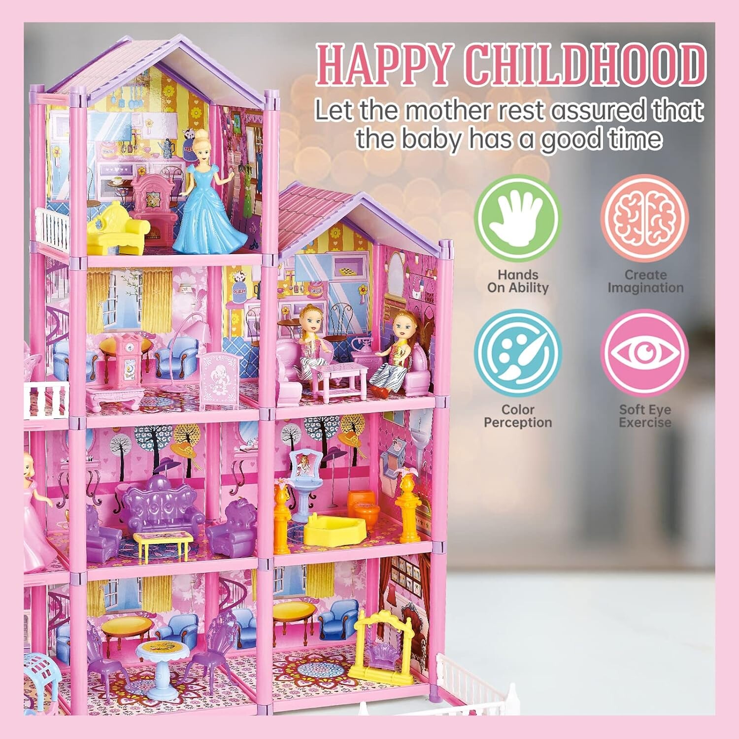 deAO Hišica za punčke »Princesa« – 4 nadstropja / 10 sob + 2 punčki + pohištvo in dodatki (ASIN: B0BVVZWD9X) je velik komplet za igranje vlog »naredi sam«, ki otrokom omogoča, da sestavijo svojo hišico in nato ustvarijo zgodbe skozi različne sobe (spalnice, dnevni prostor, balkon/podstrešje itd.). Komplet vsebuje punčke, pohištvo in dodatke (vključno z mini vozili in elementi, kot je ograda/igrišče), zato je takoj pripravljen za igro.