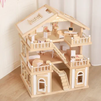 Ta razkošna lesena hišica za punčke otrokom ponuja priložnost, da skozi igro razvijajo svojo domišljijo in socialne veščine. Njena robustna konstrukcija in skrbno izdelani detajli zagotavljajo dolgotrajno in varno igro. drvenarije2025