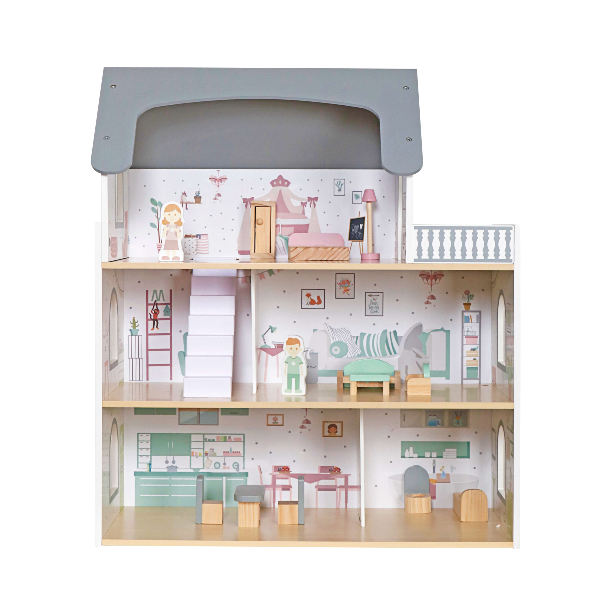 - Kakovostni materiali: Hiša je izdelana iz kombinacije lesa in MDF plošče, zato je stabilna in dolgo obstojna.
