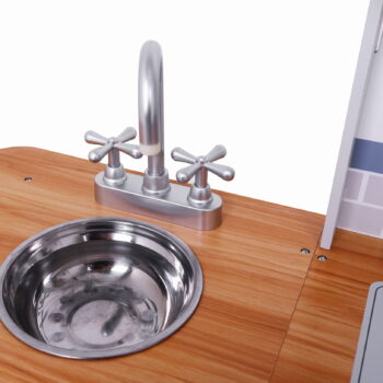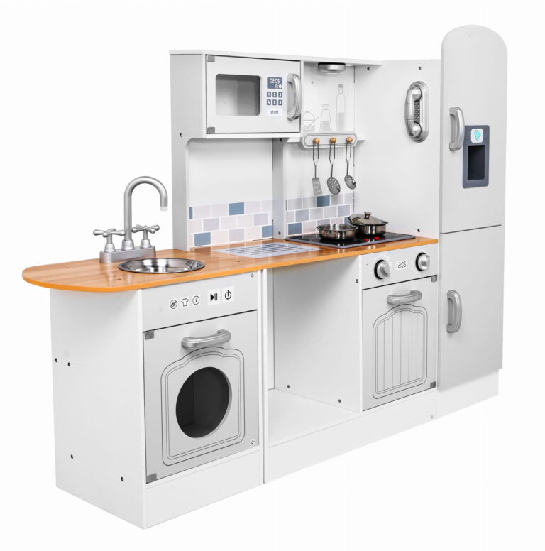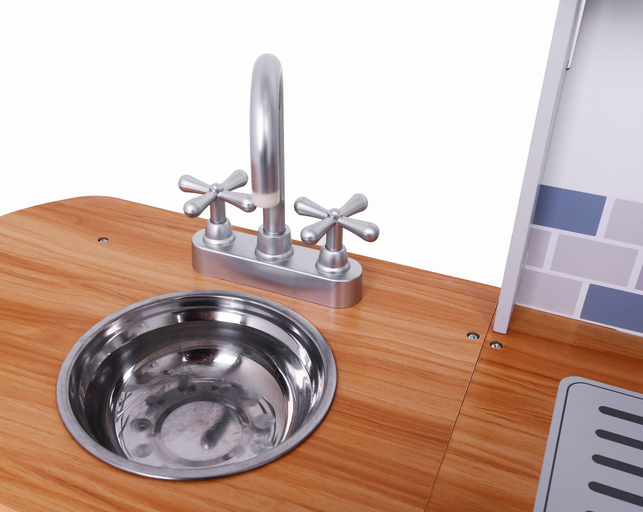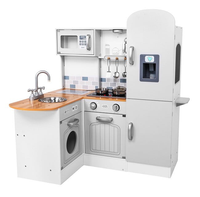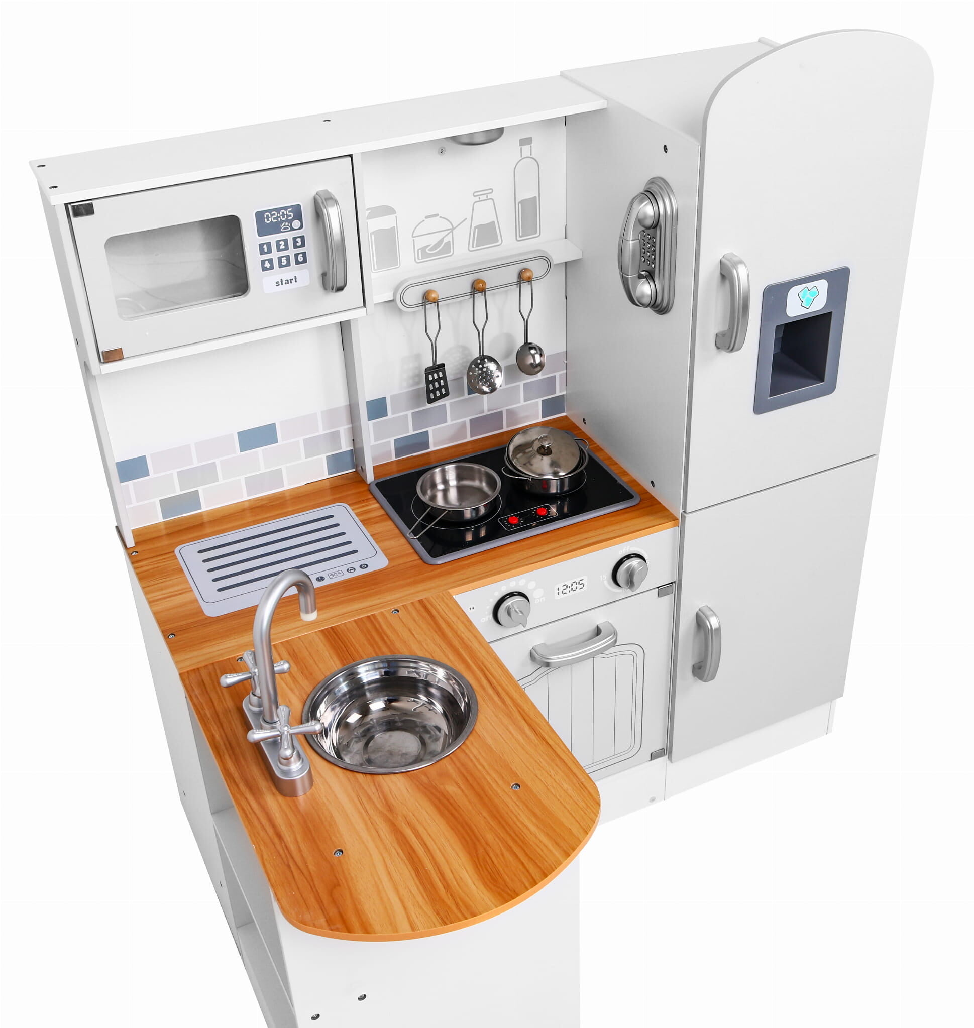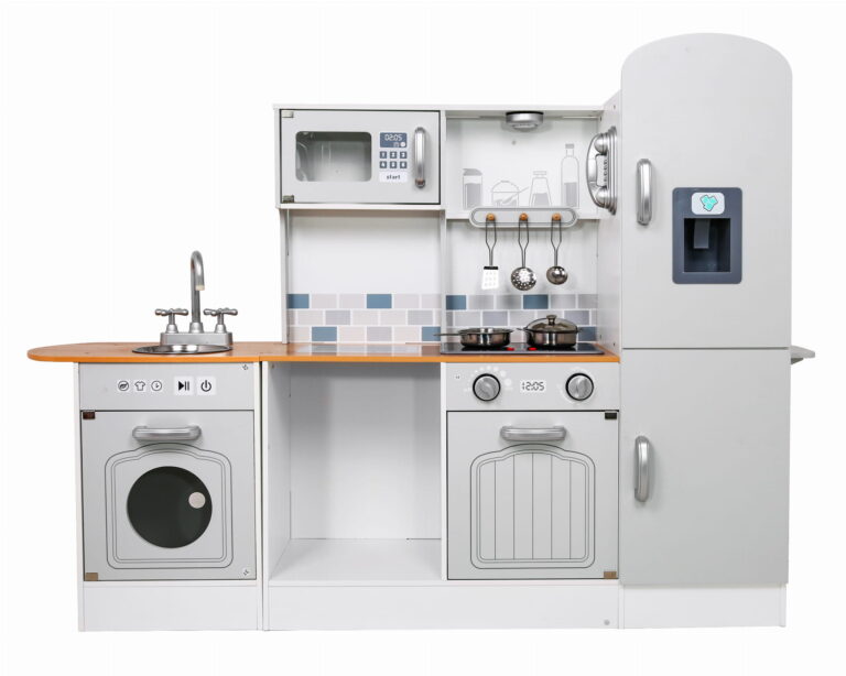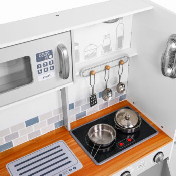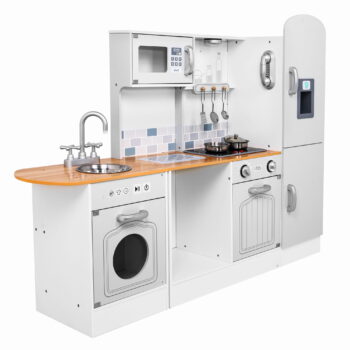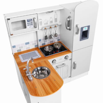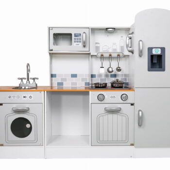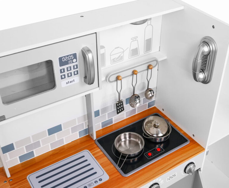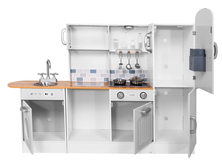 Velika lesena kuhinja je predlog za otroke od 3. leta starosti. Izdelana je iz visokokakovostnega barvnega lesa. Struktura je trdna in trpežna. Celotna konstrukcija je stabilna in odporna na zunanje poškodbe. Komplet je dobra naložba, saj bo vašim otrokom služil dolga leta. Izgleda kot prava kuhinja. Vaš otrok bo takšno igračo brez strahu vzljubil. Predstavljena kuhinja bo zaradi nevtralnih barv primerna tako za fantke kot za deklice. Lesena kuhinjska oprema:
