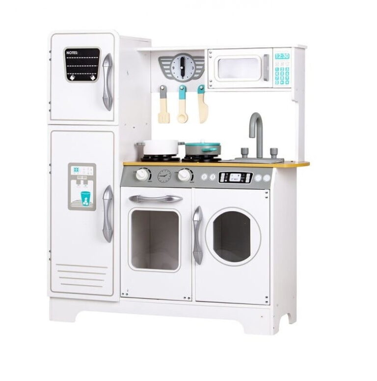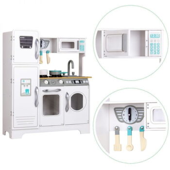 VELIKA OTROŠKA LESENA KUHINJA ZA OTROKE ELLIE Kuhinja je izdelana iz lesa in MDF-ja. Kuhinja ima vse, kar potrebujete za pripravo obrokov, dodatno pa je opremljena z odpiralnim pomivalnim strojem. Štedilnik omogoča igro s pečico, hladilnikom, mikrovalovno pečico, veliko omarico, gorilniki in pipo s pomivalnim koritom. Poleg kuhinje komplet vključuje 5 lesenih dodatkov. Vsi leseni elementi so 100 % varni za otroke – brez ostrih robov. Višina: 92 cm, širina: 74,5 cm, globina: 25,5 cm. EMBALAŽA Izdelek je pakiran v posebej ojačani transportni škatli, vsi kuhinjski elementi so ustrezno zaščiteni, da se med transportom ne poškodujejo. Dimenzije embalaže: 96,5×34,5×18,7 cm, Teža: 15 kg