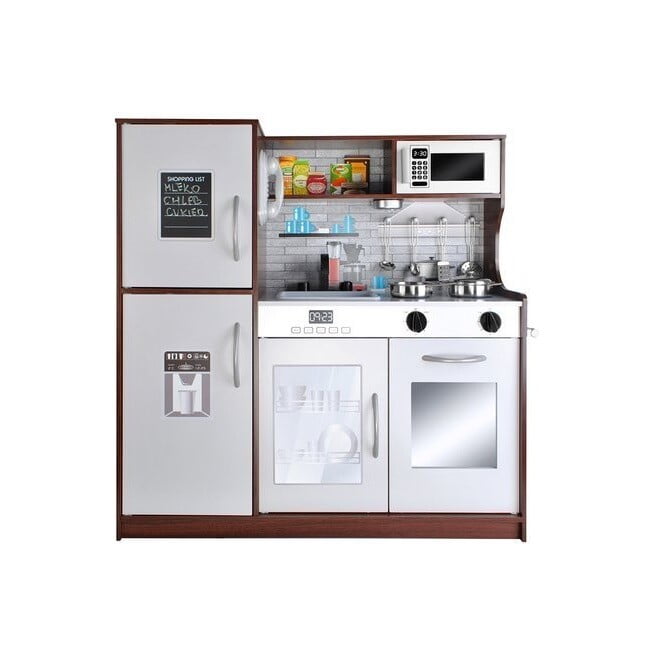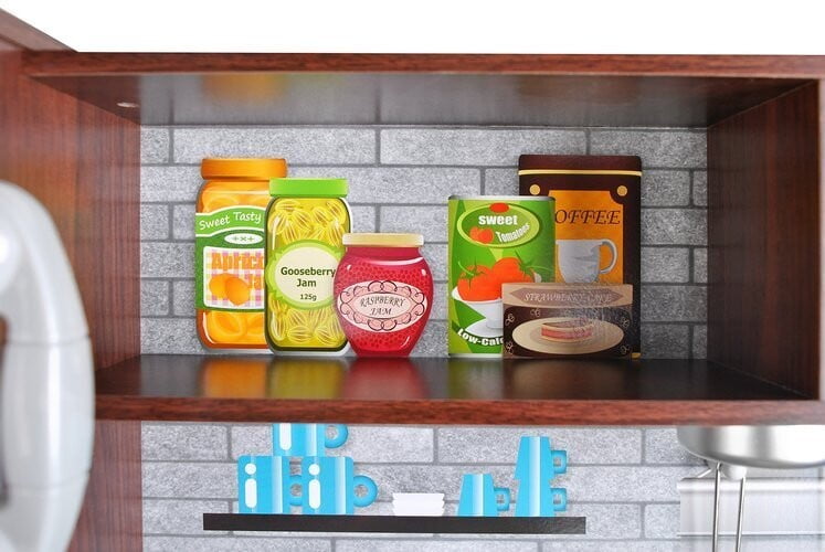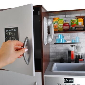 - OSVETLITEV IN ZVOK – kuhinja ima svetilko, ki jo lahko namestite pod omarico, v omaro ali v pečico – izbira je vaša! Osvetlitev bo otroku dala občutek, kot da je v pravi kuhinji , še večji učinek bo imela, ko je soba že temna, svetilka pa bo otroku omogočila, da pripravi večerjo za punčke, medvedke ali njihove starše. Poleg tega gumbi pečice ob obračanju oddajajo značilen klik. Vaš otrok bo navdušen – kuhinja mu bo nudila ure zabave.