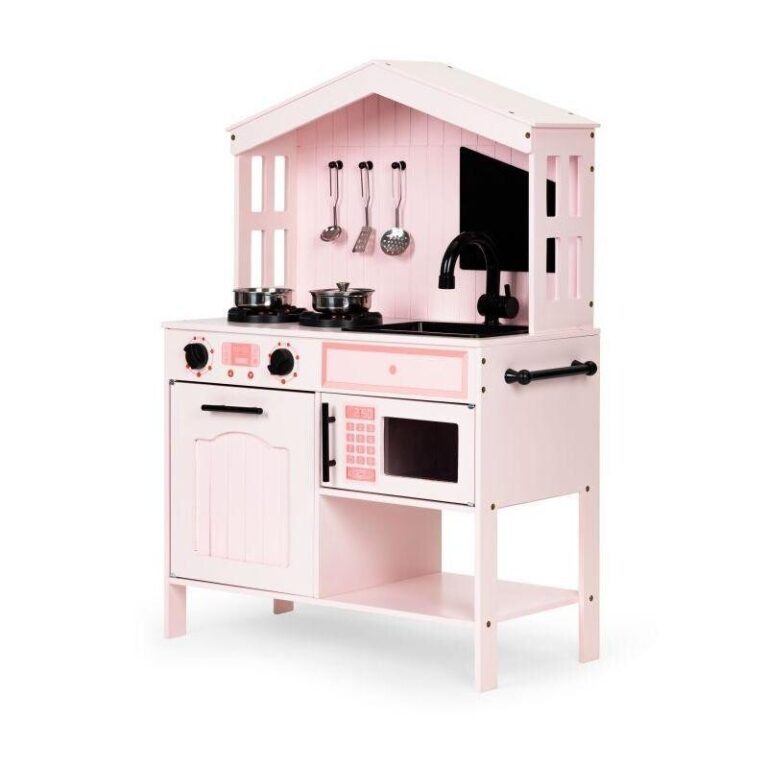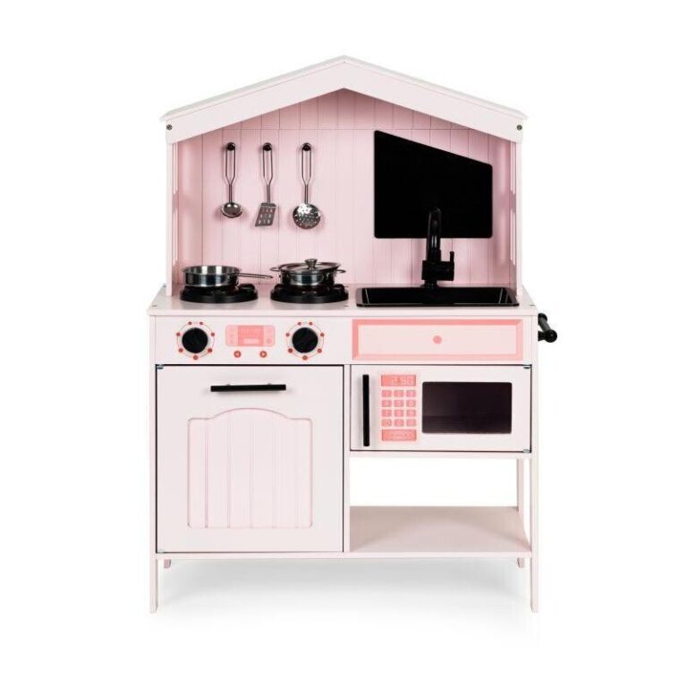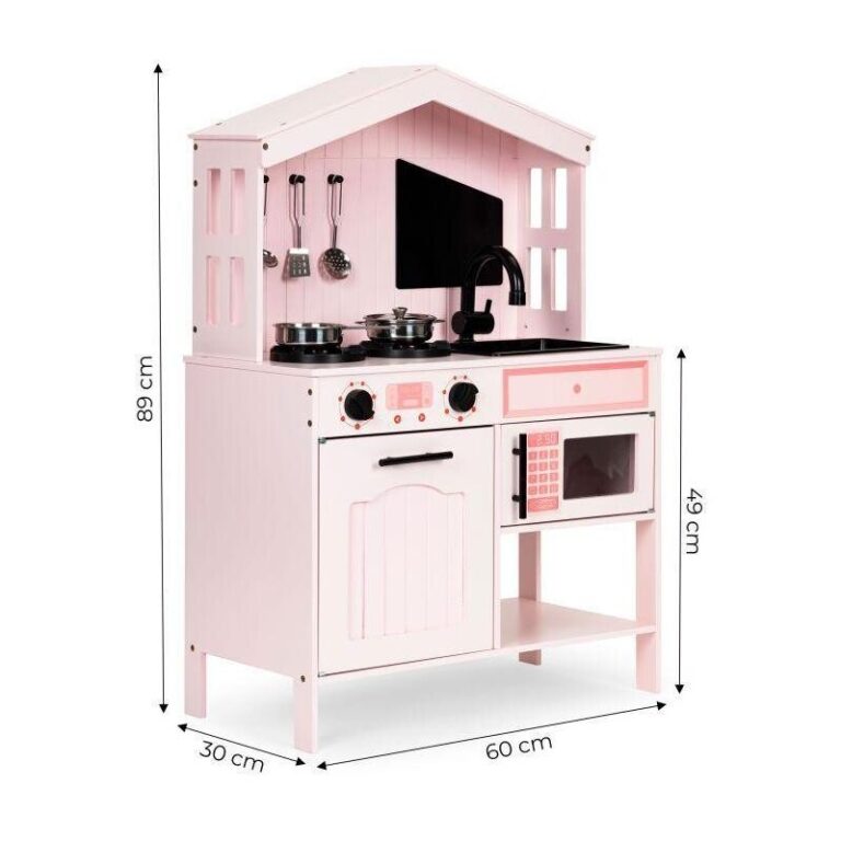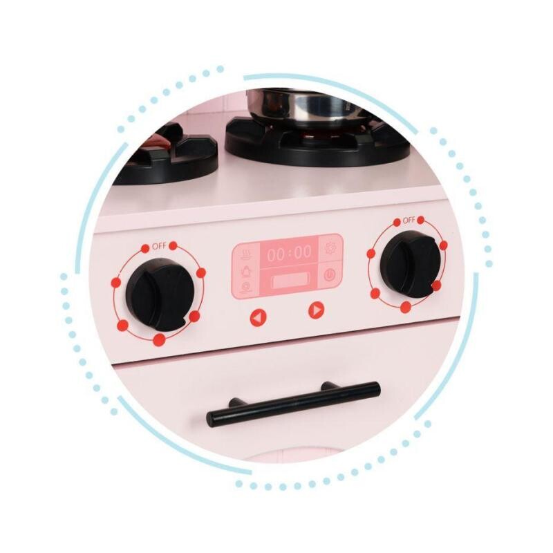 Kuhinja je opremljena z vrtljivimi gumbi, ki omogočajo simulacijo delovanja štedilnika in pečice. Otroci lahko prilagajajo temperaturo in spreminjajo nastavitve gorilnikov, kar jim omogoča ustvarjanje različnih scenarijev in igrač , ne da bi se pri tem opečli. To je odlična priložnost za ustvarjalno igro in eksperimentiranje v varnem okolju.