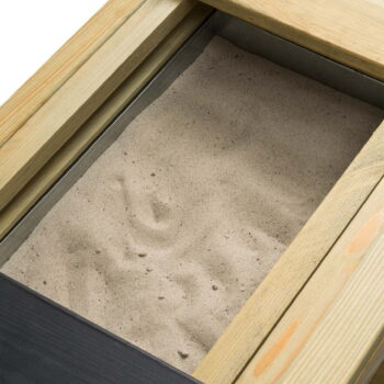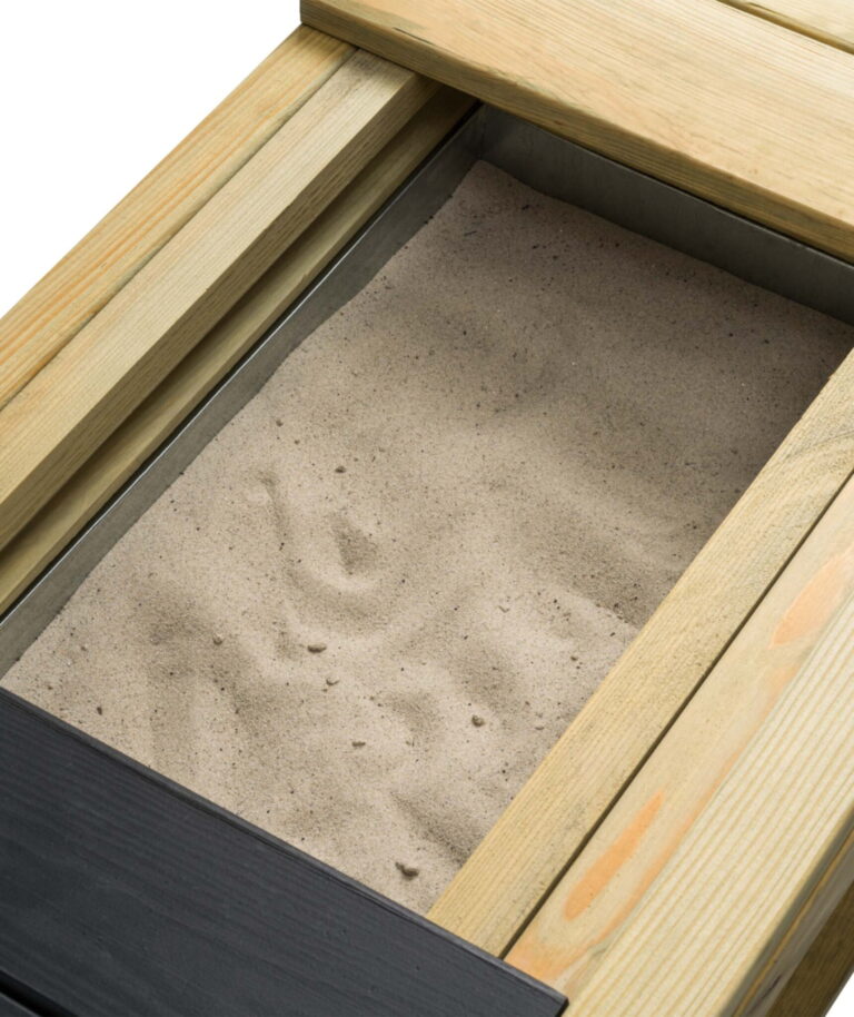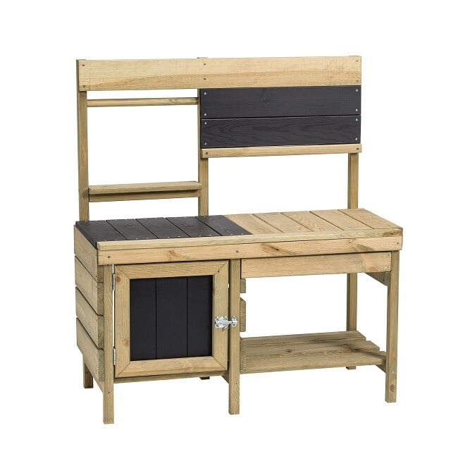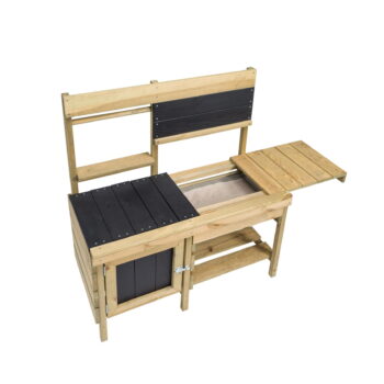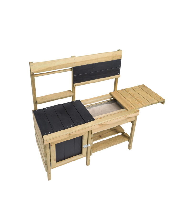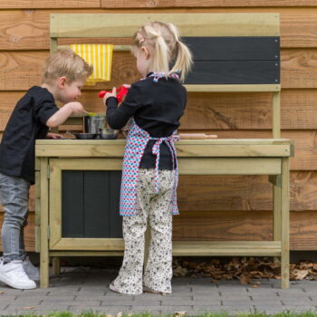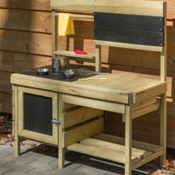 Otroška lesena kuhinja za igro je opremljena s štedilnikom in praktičnim prostorom za shranjevanje. Pult je mogoče podaljšati, kar ustvari prostor za peskovnik. Impregniran les FSC zagotavlja odpornost izdelka na različne vremenske razmere. Igralna hišica je izdelana iz impregniranega smrekovega lesa s certifikatom FSC®, ki bo zdržal leta. Dimenzije: