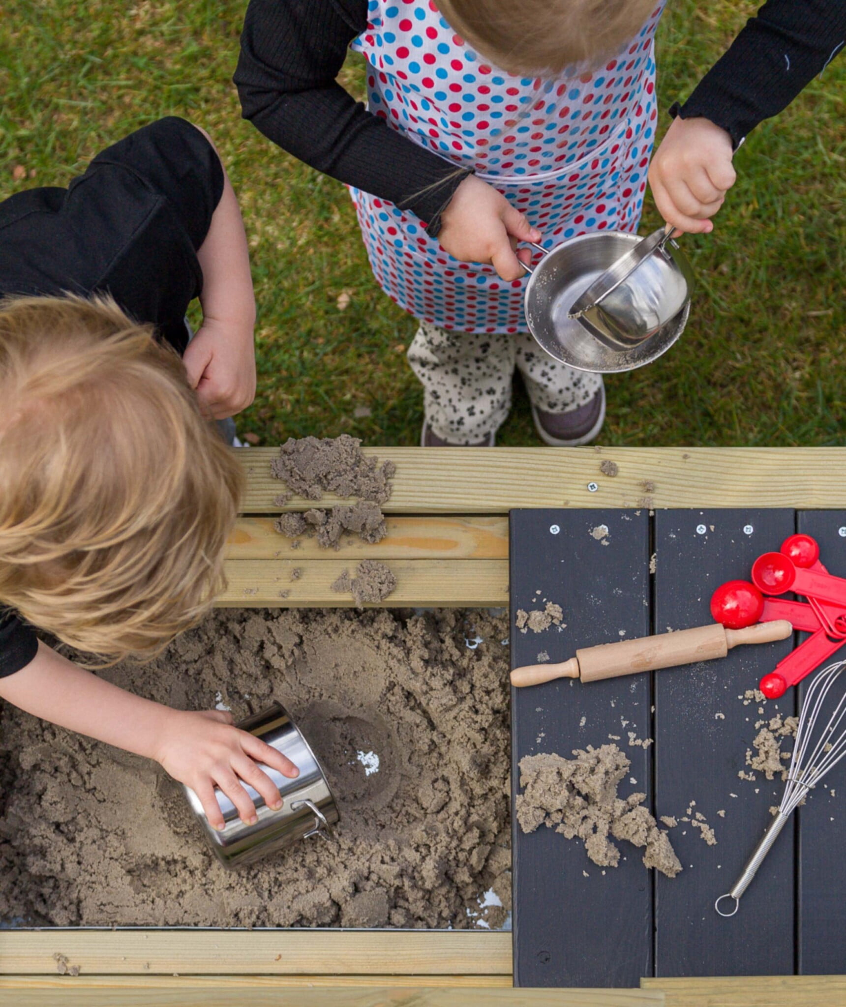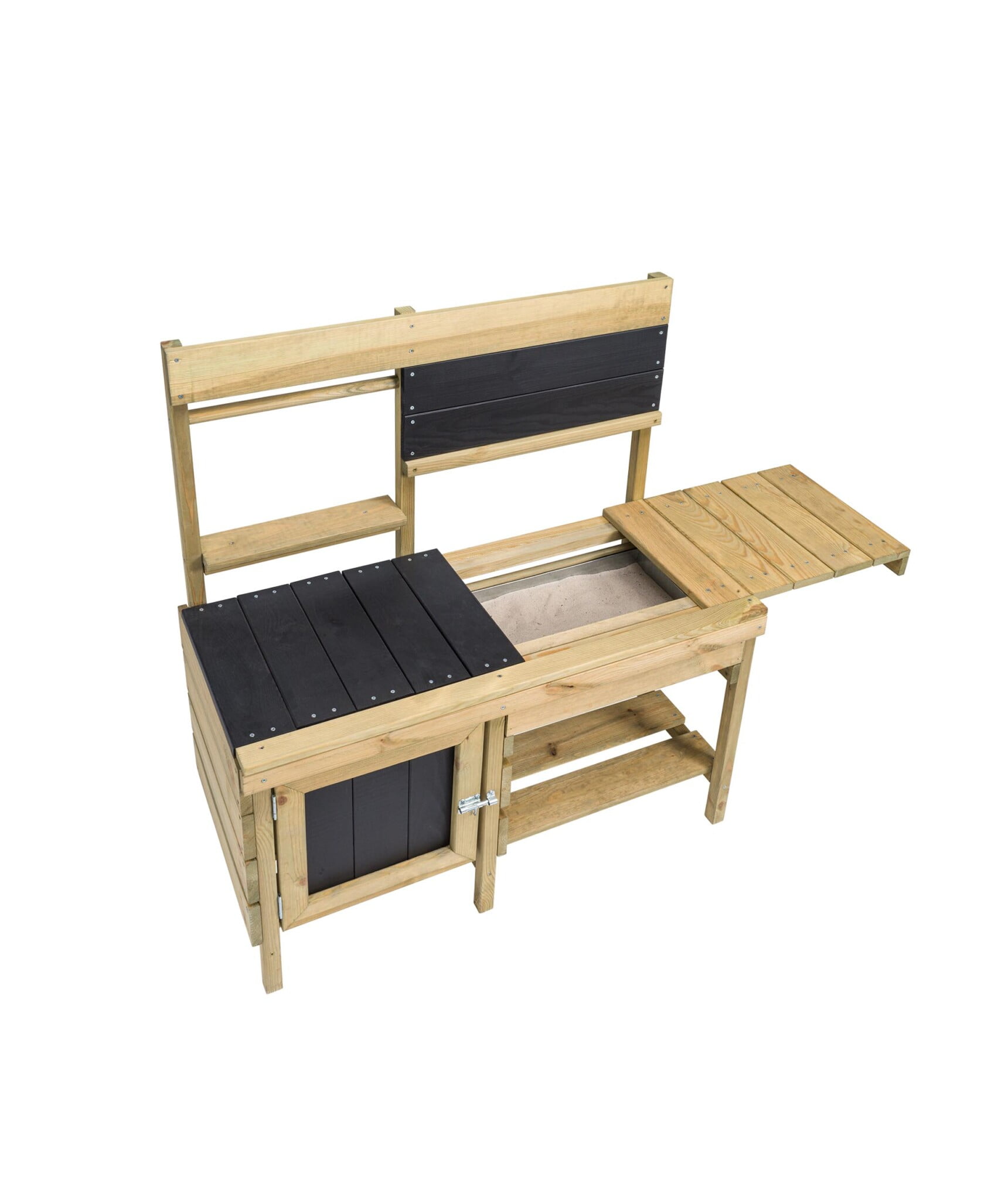 Otroška lesena kuhinja za igro je opremljena s štedilnikom in praktičnim prostorom za shranjevanje. Pult je mogoče podaljšati, kar ustvari prostor za peskovnik. Impregniran les FSC zagotavlja odpornost izdelka na različne vremenske razmere. Igralna hišica je izdelana iz impregniranega smrekovega lesa s certifikatom FSC®, ki bo zdržal leta. Dimenzije: