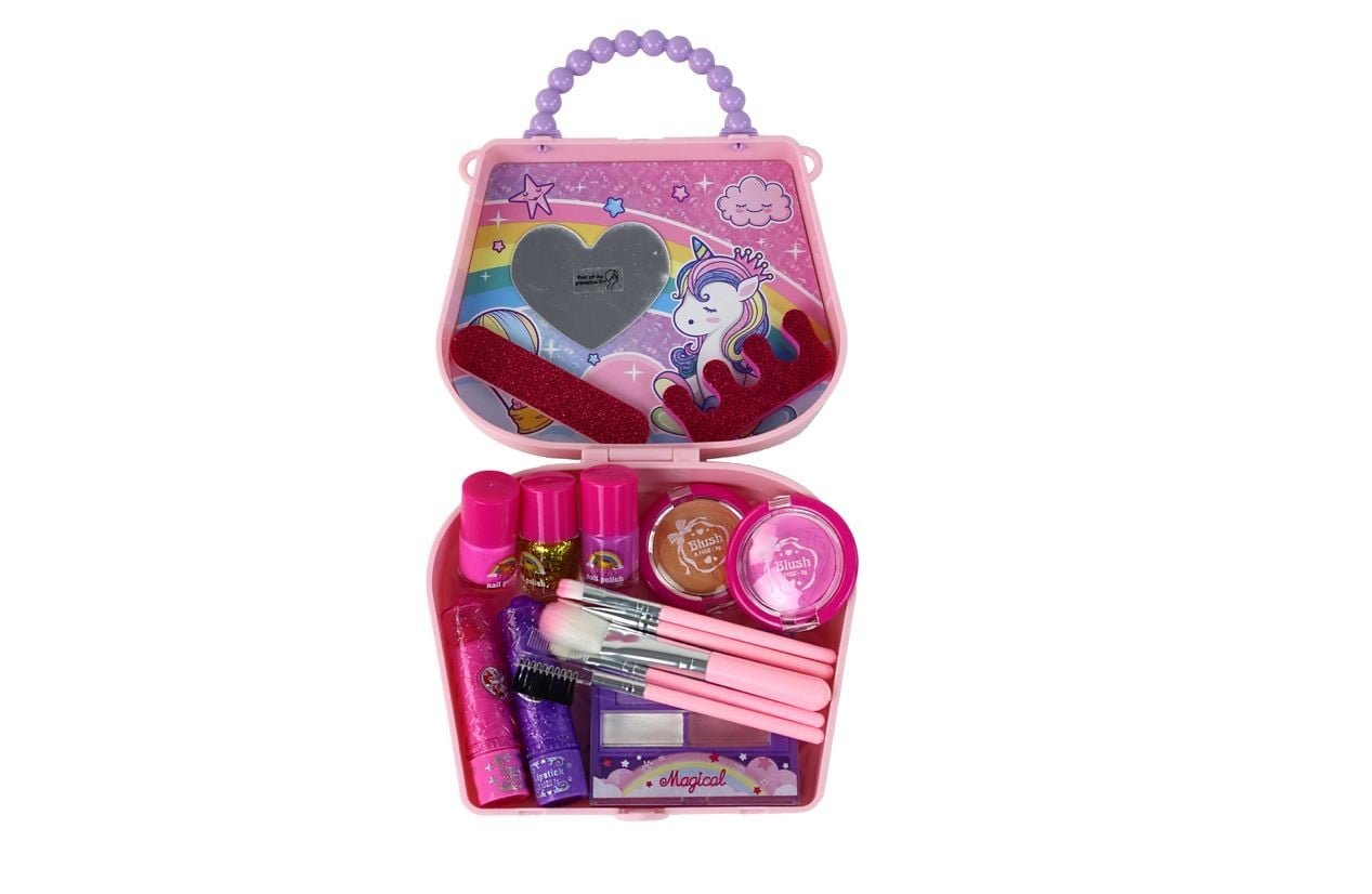 Torbica s kozmetiko, ki bo navdušila vsako dekle 71 Ta čudovit kozmetični set je popolno darilo za deklice, ki se rade igrajo z ličenjem in oblikovanjem. Set je pakiran v ljubki roza torbici, ki doda eleganco in je praktična za shranjevanje vseh vaših dodatkov. V notranjosti torbice je ljubko ogledalo v obliki srca, ki pomaga pri natančnem nanosu ličil. 70 Vsebina kompleta: – vrečka – 3 laki za nohte – pilica za nohte – ločilo za nohte – 5 čopičev za ličenje – 5 senčil za oči – 2 šminki – rdečilo za lica 737472 Dimenzije vrečke: 18 cm x 16 cm x 5 cm Velikost paketa: 17 cm x 19 cm x 7 cm 75 Ima certifikat CE in je skladna s standardom EN71 . Igrača je namenjena otrokom, starejšim od 5 let.
