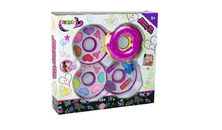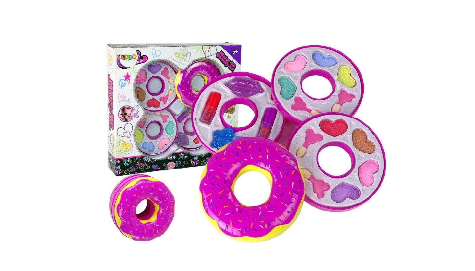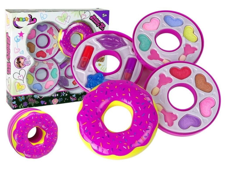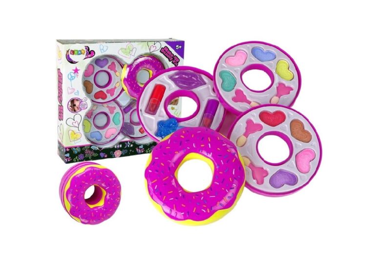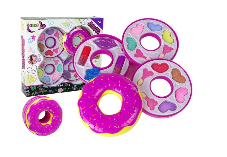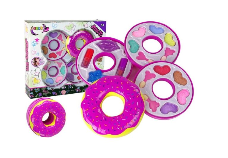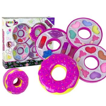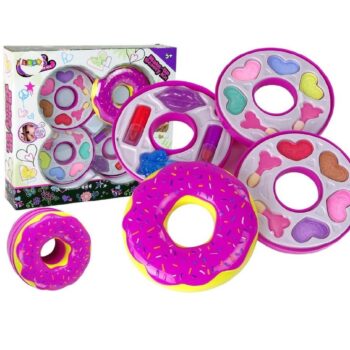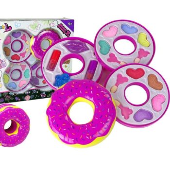 87 Komplet ličil Triple Donut vsebuje vse, kar mala princesa potrebuje za tristopenjsko preobrazbo v obliki krofa. 🙂 Krof vsebuje: – 8 senčil za oči – čopiče za ličenje – 2 šminki: rdečo in roza – bleščilo za ustnice – bleščeči lak za nohte Dimenzije zaprtega krofa: premer 11 cm višina 8 cm 88 Velikost paketa : 31 cm x 28 cm x 7 cm 89 Lepotni set je izdelan v skladu s standardom EN 71 in ima certifikat CE . Set je namenjen vsem malim princeskam, starejšim od 5 let.