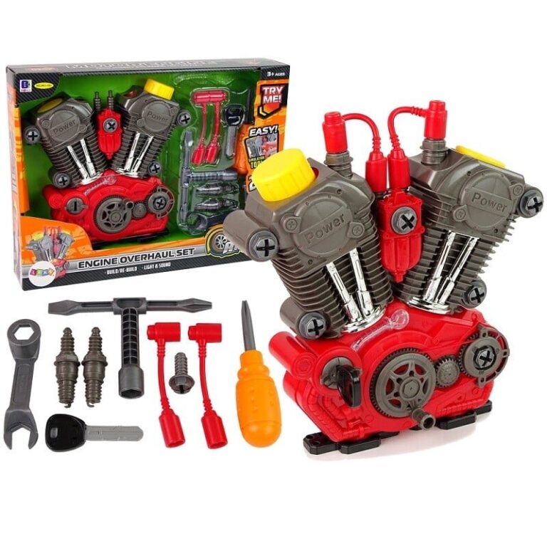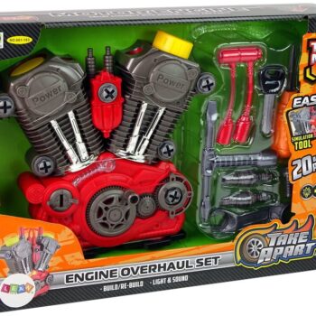 Igrača, zasnovana za male avtomehanike. Razvijala bo ročne spretnosti in vašega otroka seznanila s sestavnimi deli pravih motorjev. Omogočila mu bo razumevanje načel delovanja motorja. Poleg tega je igrača opremljena s številnimi svetlobnimi in zvočnimi učinki, ki bodo igro naredili še privlačnejšo! Motor je mogoče s priloženim orodjem razstaviti in privijačiti kolikokrat želite! Celoten komplet je enostaven za uporabo, zato bo zagotovo všeč malim domačim mojstrom od 3. leta starosti dalje. Vsi deli kompleta so izdelani iz visokokakovostne plastike, zato je komplet izjemno vzdržljiv in bo zagotovo zdržal dolgo časa! Prednosti igrače: – celoten motor je izdelan iz plastike – gibljivi bati – realistični zvoki – možnost opazovanja delovanja zobnikov – motor je mogoče razstaviti Komplet vsebuje: – motor – ključ za zagon – svečke – gumijast kabel za vžig – zvezdasti izvijač – 3v1 nasadni ključ + ploski izvijač in zvezdasti izvijač – 2v1 kombinirani ključ + obročasti ključ – vijak Dimenzije motorja 25 x 26 x 7 cm Zelo estetsko privlačen komplet, verjetno ga bo opazil veliko očetov, mehanikov in dedkov, ampak gospodje, ne pozabite, da je to igrača za otroka 🙂