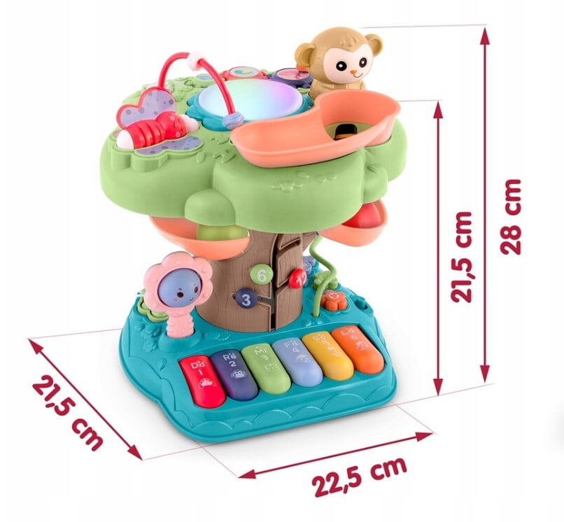 Izobraževalna igrača v obliki drevesa pomaga pri učenju številk, živali, oblik in barv ter pri uvajanju prvih angleških besed v otrokov besedni zaklad. Podpira razvoj fine motorike, vsebuje tirnico in 2 žogici, ki se spuščata po tirnici, ter klavir s prijetnimi melodijami. Sestavine: – metulj, ki po zasuku kril v angleščini reče “butterfly”, – vgrajena ropotuljica, – zobniki, – glasbeni boben z LED diodo, – opica – ko jo pritisnete, se kroglice sprostijo, – igrišče za balinanje – steza za kroglice (2 kroglici v kompletu), – klavir: tehtnica, štetje v angleščini, živali v angleščini, labirintno drevo s številkami, – izvlečna ropotuljica, – ujemanje oblik, – štetje kroglic, – stikalo, – spreminjanje načina delovanja in spreminjanje melodije.