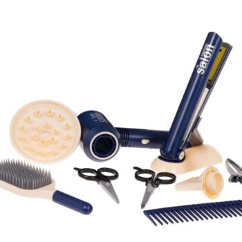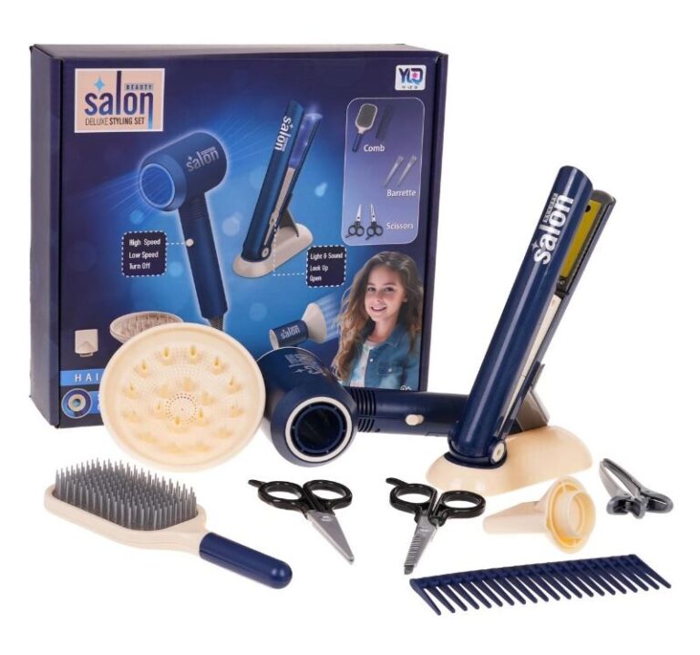 Komplet vključuje popolnoma funkcionalen sušilnik za lase , ki oddaja nežen curek zraka, tako kot pravi sušilnik za lase. Ima 2-stopenjski nadzor pretoka zraka , ki otroku omogoča prilagajanje intenzivnosti zraka glede na pričesko. Zamenljivi nastavki dodajo igri realizem. Likalnik je opremljen z drsnikom, ki omogoča zapiranje in odpiranje naprave, ima pa tudi svetlobne in zvočne učinke , zaradi katerih se otrok počuti kot pravi frizer. Stojalo omogoča estetsko shranjevanje sušilnika za lase in likalnika za lase ter ohranja red v otroškem frizerskem salonu.