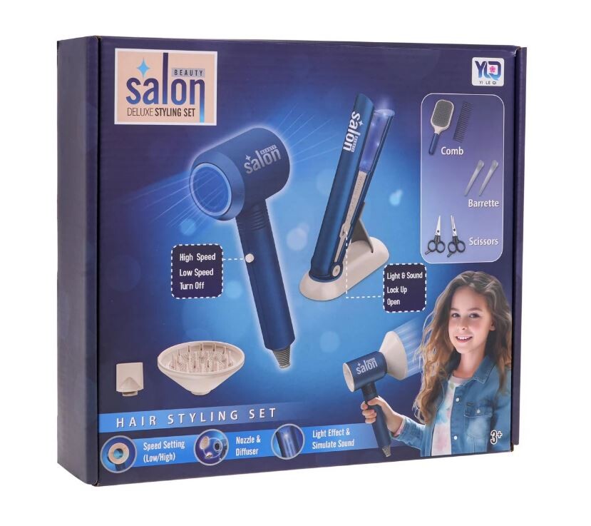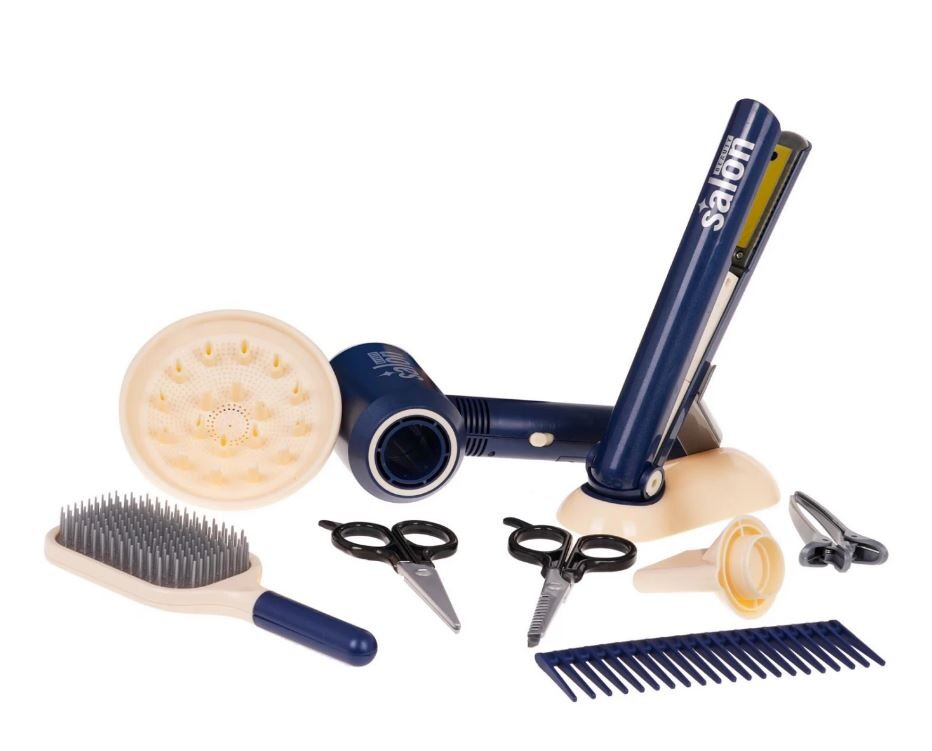 Komplet vključuje popolnoma funkcionalen sušilnik za lase , ki oddaja nežen curek zraka, tako kot pravi sušilnik za lase. Ima 2-stopenjski nadzor pretoka zraka , ki otroku omogoča prilagajanje intenzivnosti zraka glede na pričesko. Zamenljivi nastavki dodajo igri realizem. Likalnik je opremljen z drsnikom, ki omogoča zapiranje in odpiranje naprave, ima pa tudi svetlobne in zvočne učinke , zaradi katerih se otrok počuti kot pravi frizer. Stojalo omogoča estetsko shranjevanje sušilnika za lase in likalnika za lase ter ohranja red v otroškem frizerskem salonu.