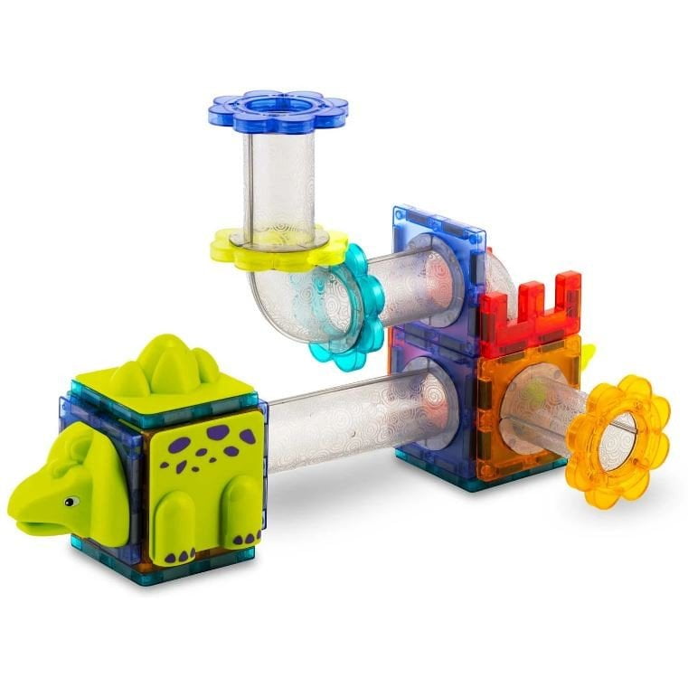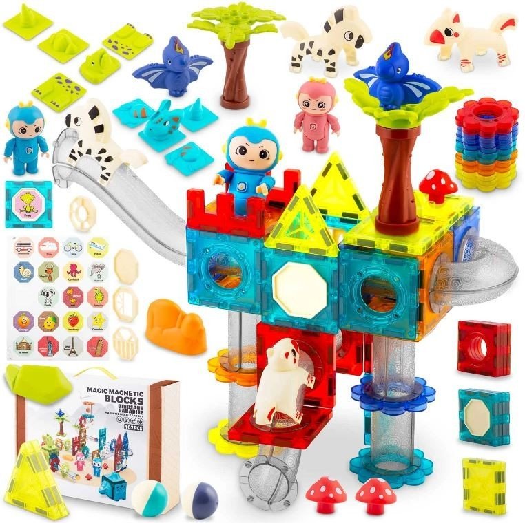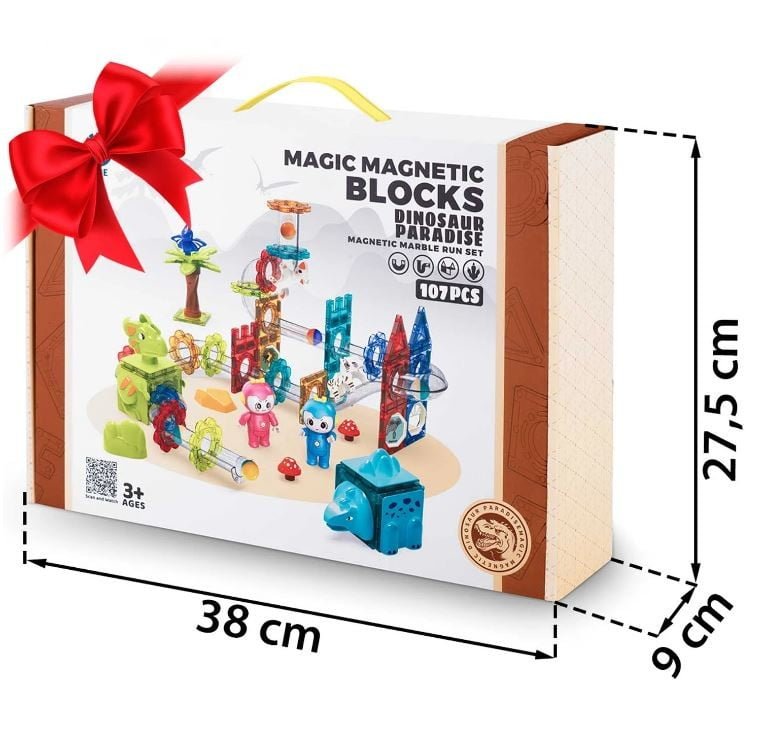 Magnetne kocke so izjemno vsestranska igrača, ta komplet 107 elementov pa vsebuje vse, kar potrebujete za ure zabave v svetu dinozavrov in živali. Prijetne barve in nalepke z raznoliko grafiko bodo vašega malčka zagotovo spodbudile k igri. Povezovanje magnetnih kock odlično razvija ročne spretnosti, fino motoriko in natančnost prstov. Načrtovanje konstrukcij spodbuja prostorsko domišljijo in uči logično razmišljanje, medtem ko opazovanje kroglic, ki se premikajo po zgrajeni poti, spodbuja vizualno zaznavanje in razvija opazovalne sposobnosti. Komplet je kot nalašč za skupno igro! Vsi elementi so izdelani iz trpežnega materiala, kar vam bo zagotovilo, da boste v kompletu uživali dolgo časa.