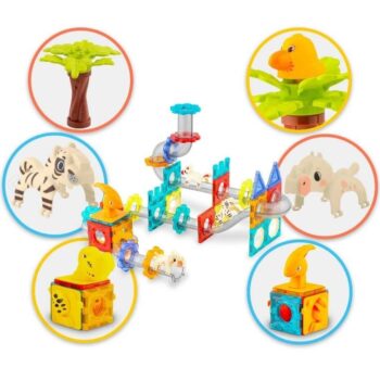 Magnetne kocke so izjemno vsestranska igrača, ta komplet 153 elementov pa vsebuje vse, kar potrebujete za ure zabave v svetu dinozavrov in živali. Prijetne barve in nalepke z raznoliko grafiko bodo vašega malčka zagotovo spodbudile k igri. Povezovanje magnetnih kock odlično razvija ročne spretnosti, fino motoriko in natančnost prstov. Načrtovanje konstrukcij spodbuja prostorsko domišljijo in uči logično razmišljanje, medtem ko opazovanje kroglic, ki se premikajo po zgrajeni poti, spodbuja vizualno zaznavanje in razvija opazovalne sposobnosti. Komplet je kot nalašč za skupno igro! Vsi elementi so izdelani iz trpežnega materiala, kar vam bo zagotovilo, da boste v kompletu uživali dolgo časa.