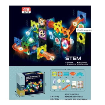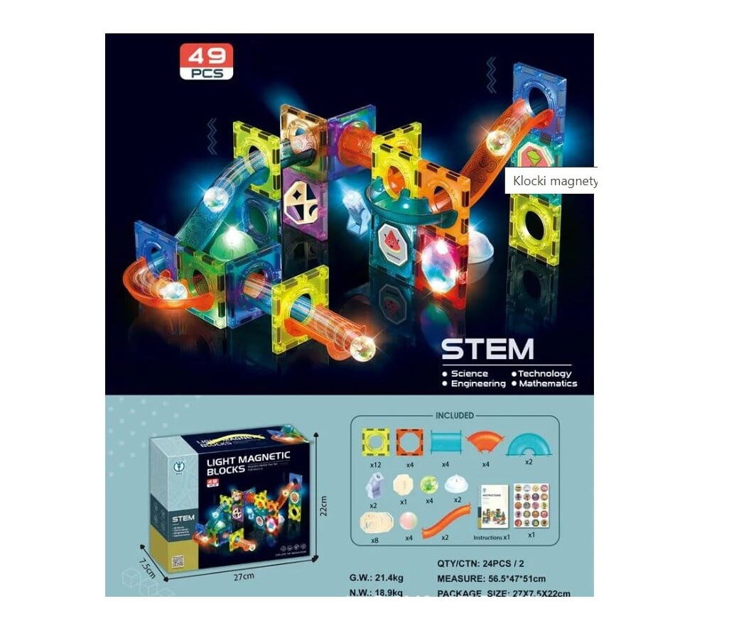 Magnetne kocke so izjemno vsestranska igrača, ta komplet 49 elementov pa vsebuje veliko svetlečih elementov, vključno z žogicami, ki se ob premikanju začnejo svetiti. 🙂 Zahvaljujoč njim kroglice po sestavljanju proge ustvarijo pravo svetlobno predstavo! Lučke in reflektorji vam bodo omogočili, da konstrukcijo dodatno osvetlite, da bo videti še bolj spektakularna. Prijetne barve in nalepke z raznoliko grafiko bodo vašega malčka zagotovo spodbudile k igri. Povezovanje magnetnih kock odlično razvija ročne spretnosti, fino motoriko in natančnost prstov. Načrtovanje konstrukcij spodbuja prostorsko domišljijo in uči logično razmišljanje, medtem ko opazovanje kroglic, ki se premikajo po sestavljani progi, spodbuja vizualno zaznavanje in razvija opazovalne sposobnosti. Komplet je kot nalašč za skupno igro! Vsi elementi so izdelani iz trpežnega materiala, kar vam bo zagotovilo, da boste v kompletu uživali dolgo časa.