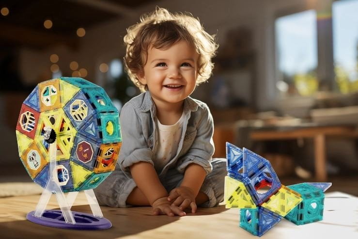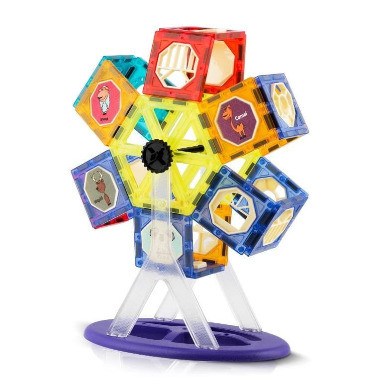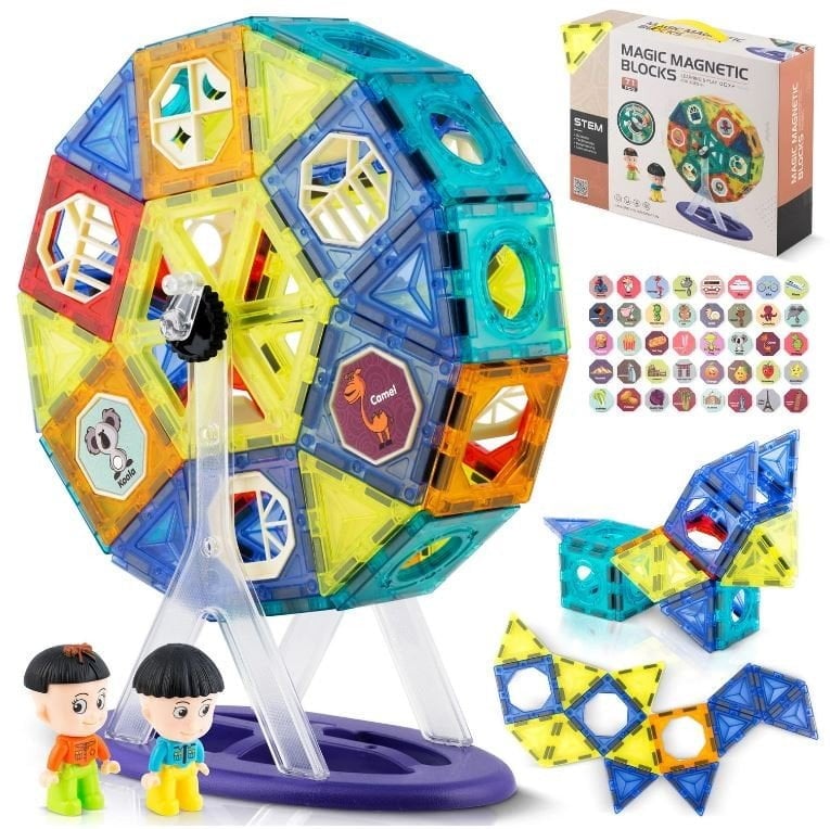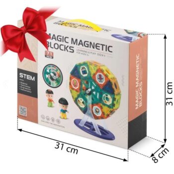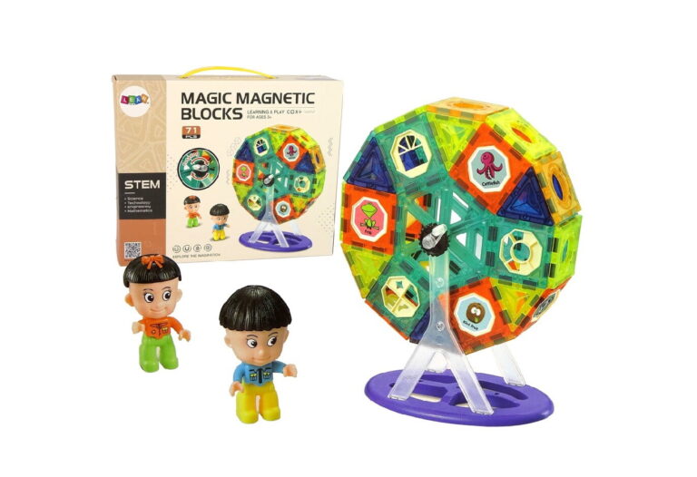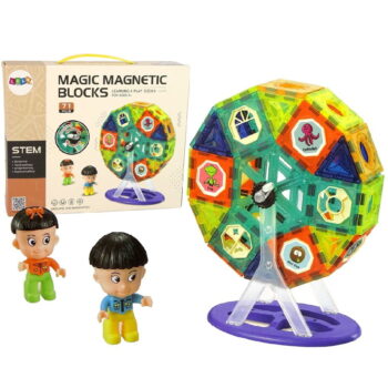 Magnetne kocke omogočajo ustvarjanje različnih oblik in struktur ter so idealna izobraževalna igrača, ki razvija ročne spretnosti in ustvarjalno razmišljanje. Spodbujajo vas k eksperimentiranju z različnimi konstrukcijami. Vsaka kocka ima na koncu magnete, ki se privlačijo in omogočajo ustvarjanje tridimenzionalnih struktur, zgradb, gradov, domino sestavljank itd. Množica možnih struktur za sestavljanje bo vašemu otroku zagotovila veliko ur odlične zabave. Kocke je mogoče enostavno razstaviti in ponovno sestaviti. Komplet vsebuje 71 elementov. Nalepke, ki so priložene kompletu, prikazujejo živali, zelenjavo ali sadje. Lahko zgradite grad ali naredite majhen zabaviščni park s panoramskim kolesom. Kocke so varne in izdelane iz trpežnih materialov, kar zagotavlja dolgo življenjsko dobo izdelka.