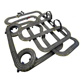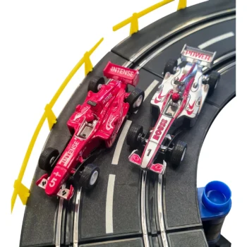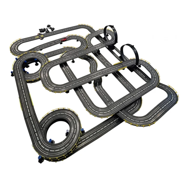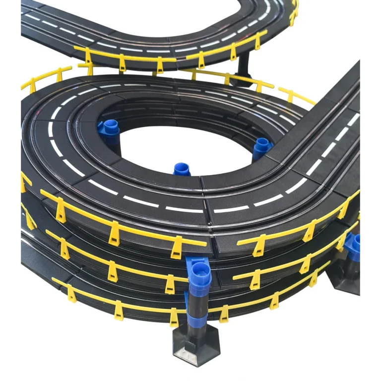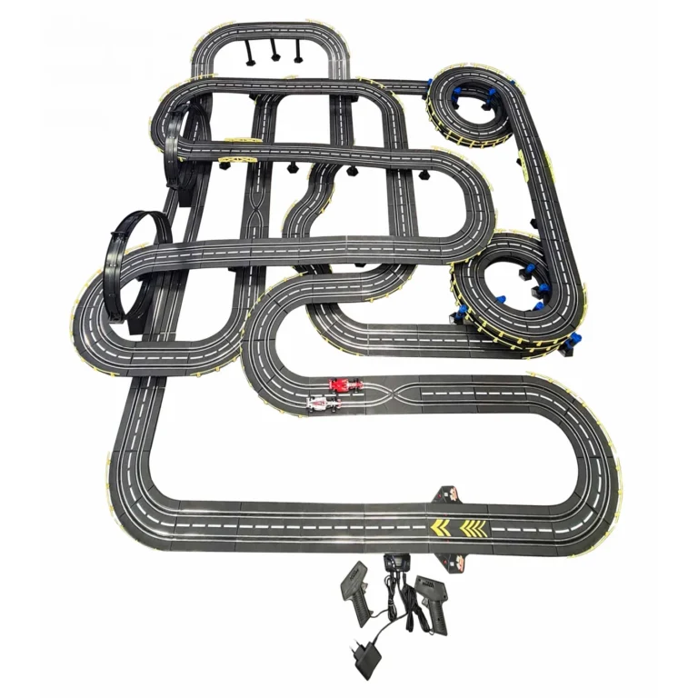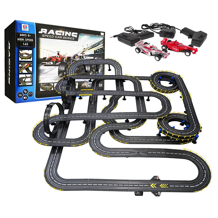 Ta gigantična dirkalna steza v merilu 1:43 z ostrimi zavoji, krožnimi vajami in avtomobilčki na daljinsko upravljanje je kot nalašč za otroke, stare 6 let in več. Po stezi se lahko hkrati premikata dva avtomobilčka. Smer in hitrost se upravljata z daljinskimi upravljalniki. Vsako vozilo se upravlja z ločenim daljinskim upravljalnikom. Steza je izdelana iz najkakovostnejših materialov, kar zagotavlja vzdržljivost in trdnost. Steza ima ravne odseke, ostre zavoje z ovirami, ki preprečujejo padec vozil s steze, in dve 360-stopinjski krožni vajah. Skupna dolžina steze je neverjetnih 2800 cm.