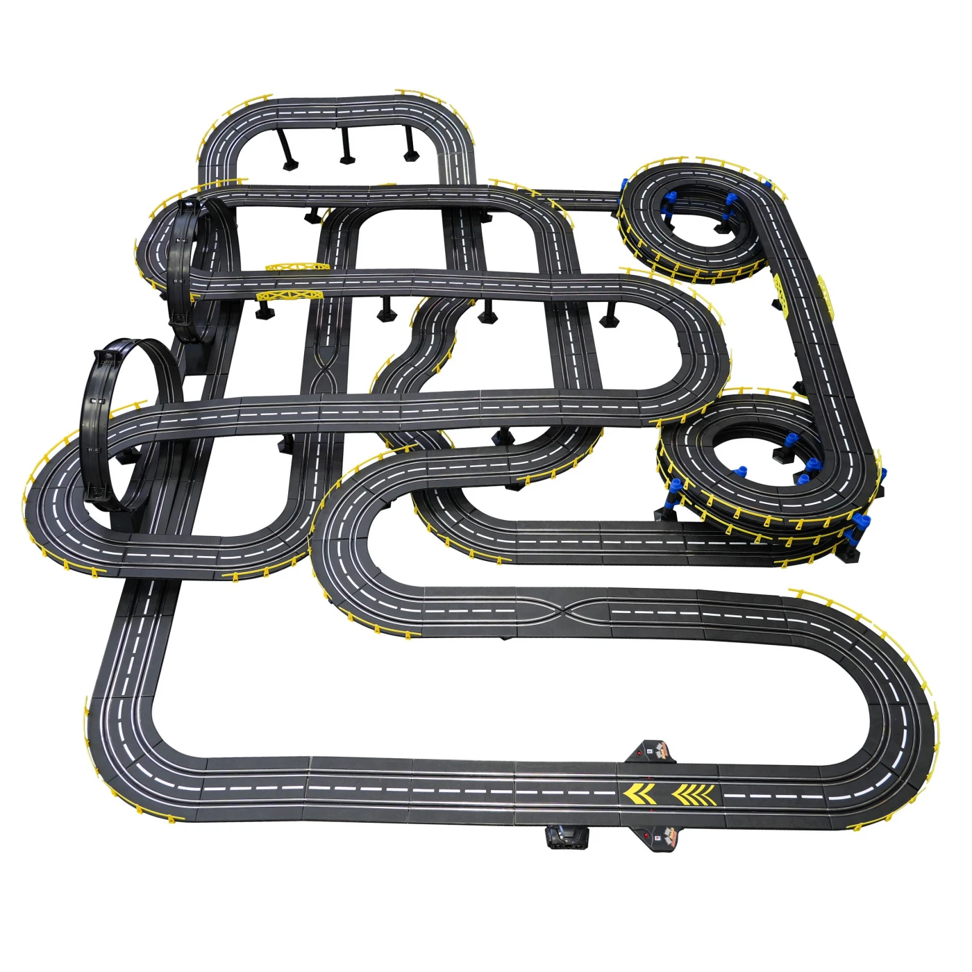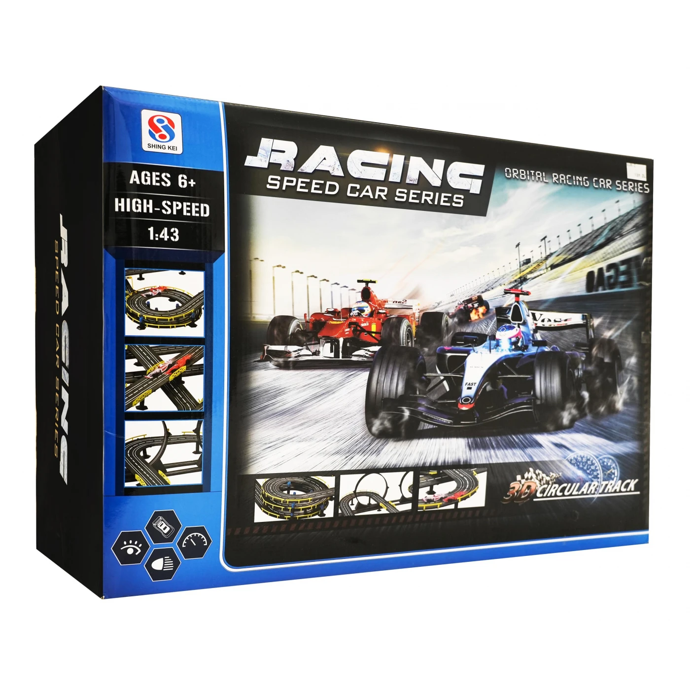 Ta gigantična dirkalna steza v merilu 1:43 z ostrimi zavoji, krožnimi vajami in avtomobilčki na daljinsko upravljanje je kot nalašč za otroke, stare 6 let in več. Po stezi se lahko hkrati premikata dva avtomobilčka. Smer in hitrost se upravljata z daljinskimi upravljalniki. Vsako vozilo se upravlja z ločenim daljinskim upravljalnikom. Steza je izdelana iz najkakovostnejših materialov, kar zagotavlja vzdržljivost in trdnost. Steza ima ravne odseke, ostre zavoje z ovirami, ki preprečujejo padec vozil s steze, in dve 360-stopinjski krožni vajah. Skupna dolžina steze je neverjetnih 2800 cm.
