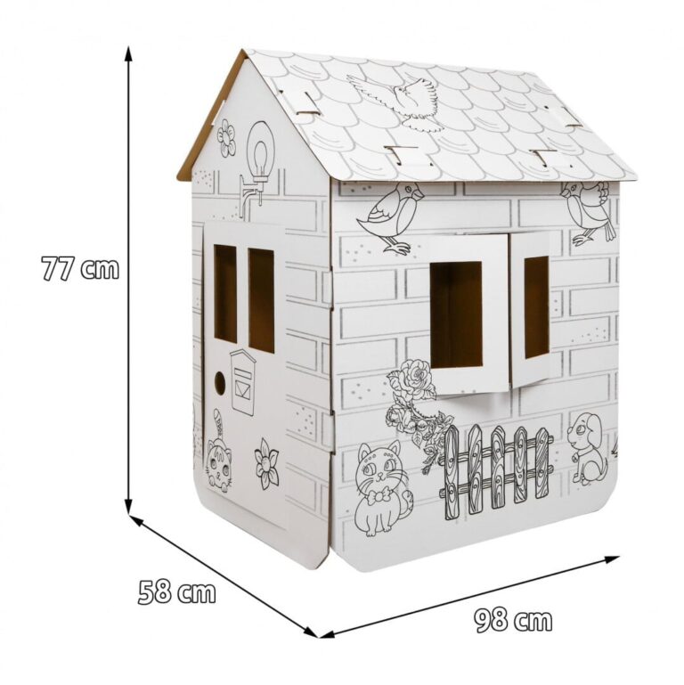 Opis Kartonska hišica za risanje Kartonska hišica za otroke od 3. leta starosti. Hiška ima premične elemente, kot so okna in vrata, ki se lahko odpirajo. Z igro s to hišico bo otrok spodbujal svojo domišljijo, razvijal ustvarjalnost in umetniške sposobnosti. Po sestavljanju se hišica lahko pobarva (komplet ne vključuje pripomočkov za slikanje). Dimenzije – hišica po sestavljanju približno 98 cm x 58 cm x 77 cm, – dimenzije embalaže približno 98 cm x 77 cm x 3,5 cm. Vsebina kompleta – hišica za samostojno sestavljanje