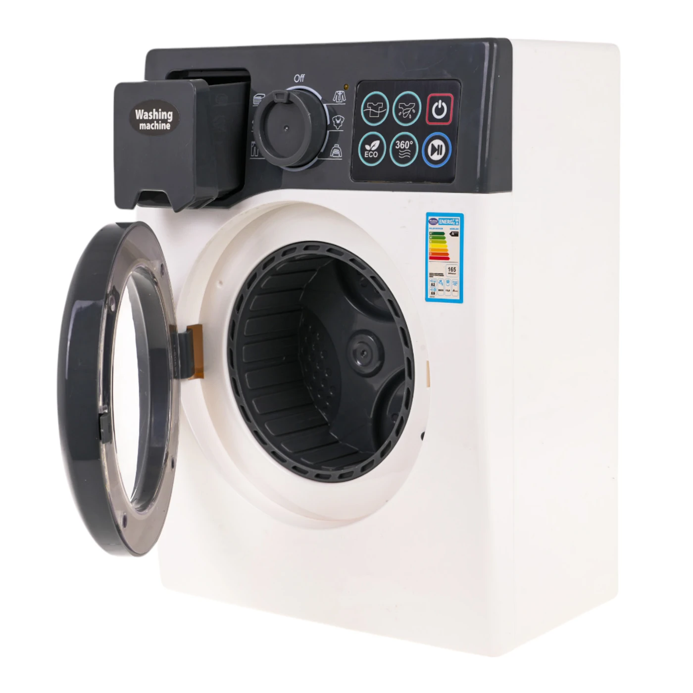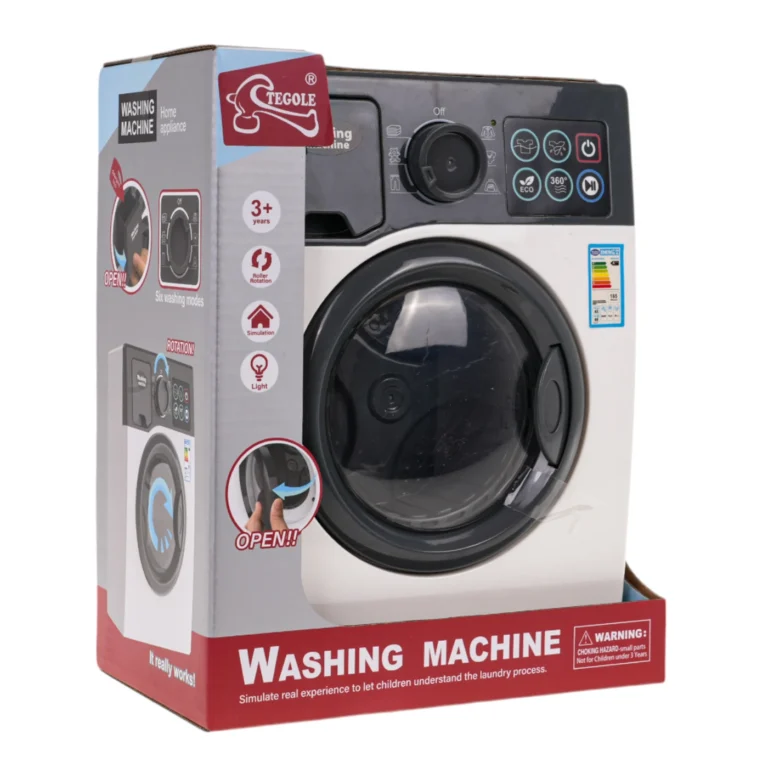 Realistična igra »tako kot doma«. Velik pralni stroj z vrtljivim bobnom, odpirajočimi se vrati in programsko ploščo otroke uči osnov gospodinjskih opravil skozi zabavo.