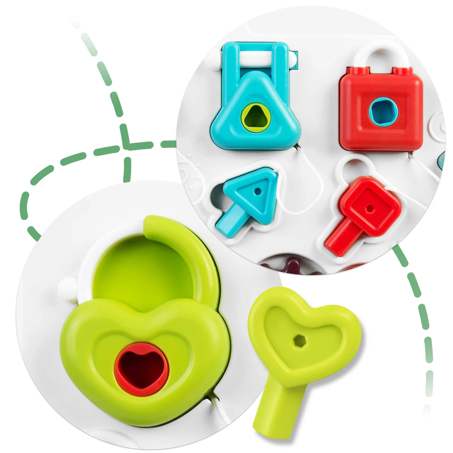 Izobraževalna tabla in miza v enem! Izdelek je idealen za učenje številk, barv in oblik. Odstranljiva tabla se lahko uporablja kot izobraževalna tabla, po dodajanju nog pa se hitro spremeni v izobraževalno mizo. Izobraževalna plošča vsebuje: – premično ključavnico s ključem v obliki srca, – premično ključavnico v obliki trikotnika s ključem, – premično ključavnico v obliki pravokotnika s ključem, – lučko (LED) z zvokom – imitacijo vtičnice in kontakta – ročico za vklop/izklop – izskočni opekač kruha, ki oddaja zvok – zobnike – hišo z vrati – klavir: živalski zvoki (upravljanje glasnosti po dolgem pritisku)