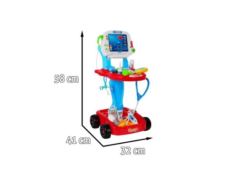 Prenosna medicinska klinika – Mali zdravnik Medicinska klinika je namenjena otrokom od 3. leta starosti. Paket vsebuje številne dodatke, ki jih zdravniki uporabljajo vsak dan, večina elementov pa ima interaktivne ali zvočne učinke, kar je še posebej zanimivo za majhne otroke. EKG/rentgenski monitor z zvoki in melodijami je eden najzanimivejših elementov tega kompleta. Otroci lahko vstavijo eno od 6 slik, ki so priložene kompletu, nato pa na samem monitorju aktivirajo zvočne učinke. Prvi gumb predvaja srčni utrip in sproži alarm, ko srčni utrip postane previsok, kar otroke uči, kako nevaren je hiter srčni utrip. Drugi gumb predvaja 4 vesele pesmi, od katerih je ena znana otroška uspešnica Baby Shark, zadnji gumb pa predvaja 5 različnih zvokov. Številni dodatki uporabljajo svetlobne učinke, vključno s termometrom, stetoskopom, ultrazvočno sondo, diagnostično svetilko in zobnim ogledalom. Poleg tega stetoskop predvaja zvok utripajočega srca, termometer pa ob vklopu predvaja značilen zvok merjenja temperature. Interaktivne funkcije kompleta zahtevajo baterije – 11 kosov tipa AG13 / LR44, ki so priložene, in 2 bateriji AA, ki nista priloženi paketu. Ta 20-delni komplet zagotavlja ure zabave za male zdravnike. Komplet vključuje: Medicinski voziček s policami za pripomočke in predalom EKG / rentgenski monitor z zvoki Stetoskop z zvokom srčnega utripa Zobno ogledalo, ki sveti Ultrazvočna sonda, ki sveti Diagnostična svetilka, ki sveti Digitalni termometer, ki sveti in predvaja zvok Merilnik krvnega tlaka Skalpel Škarje Medicinske klešče Škarje za povoje Nevrološko kladivo Funkcionalna brizga Medicinski nož Ponarejena škatla za zdravila Slike rentgenskega monitorja 6x Držalo za kartice pacienta Merilnik srčnega utripa Dekorativne nalepke Navodila za sestavljanje Dimenzije paketa – približno 48 x 41 x 12 cm. Dimenzije medicinske ambulante – približno 43 x 30 x 60 cm. cleanupsale