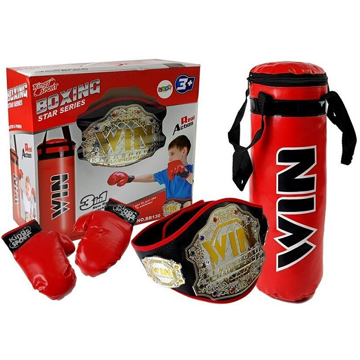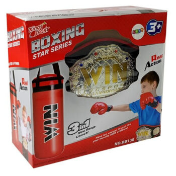 Boksarski komplet: boksarska vreča, rokavice, pas Če vašega otroka zanima šport, še posebej boks, ni treba čakati. Naš boksarski komplet bo popolno darilo. Energičen trening in nepozabna zabava sta odličen način za porabo odvečne energije. To bo izboljšalo otrokovo motorično koordinacijo, hitrost in okretnost, poleg tega pa se bo naučil izogibati udarcem. Komplet ima klasično črno-rdečo barvno shemo. Skrbno izdelan s pozornostjo do detajlov, najkakovostnejši materiali pa ga naredijo zelo robustno in vzdržljivo igračo. Priložene rokavice se odlično dopolnjujejo s kompletom, zmagovalec pa po uspešnem treningu ali zabavnem boju prejme pas z zlatimi elementi in pisanimi diamanti. Boksarski komplet vključuje: – boksarsko vrečo – boksarske rokavice – pritrjene z ježkom – zmagovalni pas Dimenzije boksarske vreče: višina – 37 cm premer – 15 cm dolžina pasu: 100 cm Dimenzije škatle: 40 cm x 36 cm x 17,5 cm Komplet je namenjen otrokom, starejšim od 3 let . Igrače imajo certifikat CE in so skladne s standardom EN 71. Komplet je pakiran v pisani škatli, zaradi česar je odlično darilo za otroka.