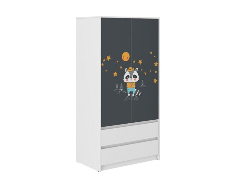 Otroška garderobna omara z izbiro različnih motivov. Spredaj s tiskom. Hrbtna stran omare je bele barve. Robovi – obdelani z visokokakovostnim PVC materialom visoke kakovosti. Mehanska in kemična odpornost. Okvir in sprednja stran – laminirana plošča. Dimenzije: 180cm x 90cm x 51cm. Dimenzije embalaže: 1335x560x70mm (1/3) 27kg. 1170x575x90mm (2/3) 28kg. 1310x490x50mm (3/3) 14kg. Država porekla: EU.