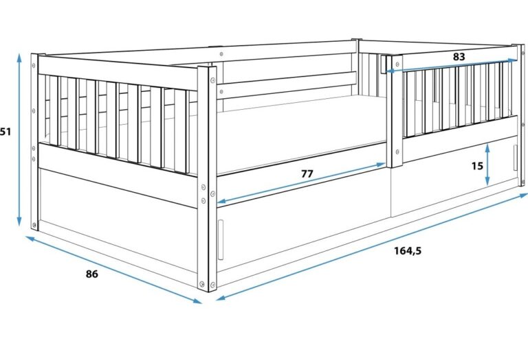 Okvir postelje iz borovega lesa, lakiran z lakom za borov les na vodni osnovi. Jekleni vijak – pohištveni dodatki. HDF plošča v beli barvi. Posoda brez spodnje deske. Vzmetnica – dimenzije 160×80 (prešita hipoalergena poliestrska tkanina + zračna vlakna + poliuretanska pena + zadrga). Lesen okvir (borove letvice). PVC ročaj. HDF plošča. Največja obremenitev je 100 kg. Zaobljeni robovi – polmer R2. Dimenzije Navodila za sestavljanje back2school