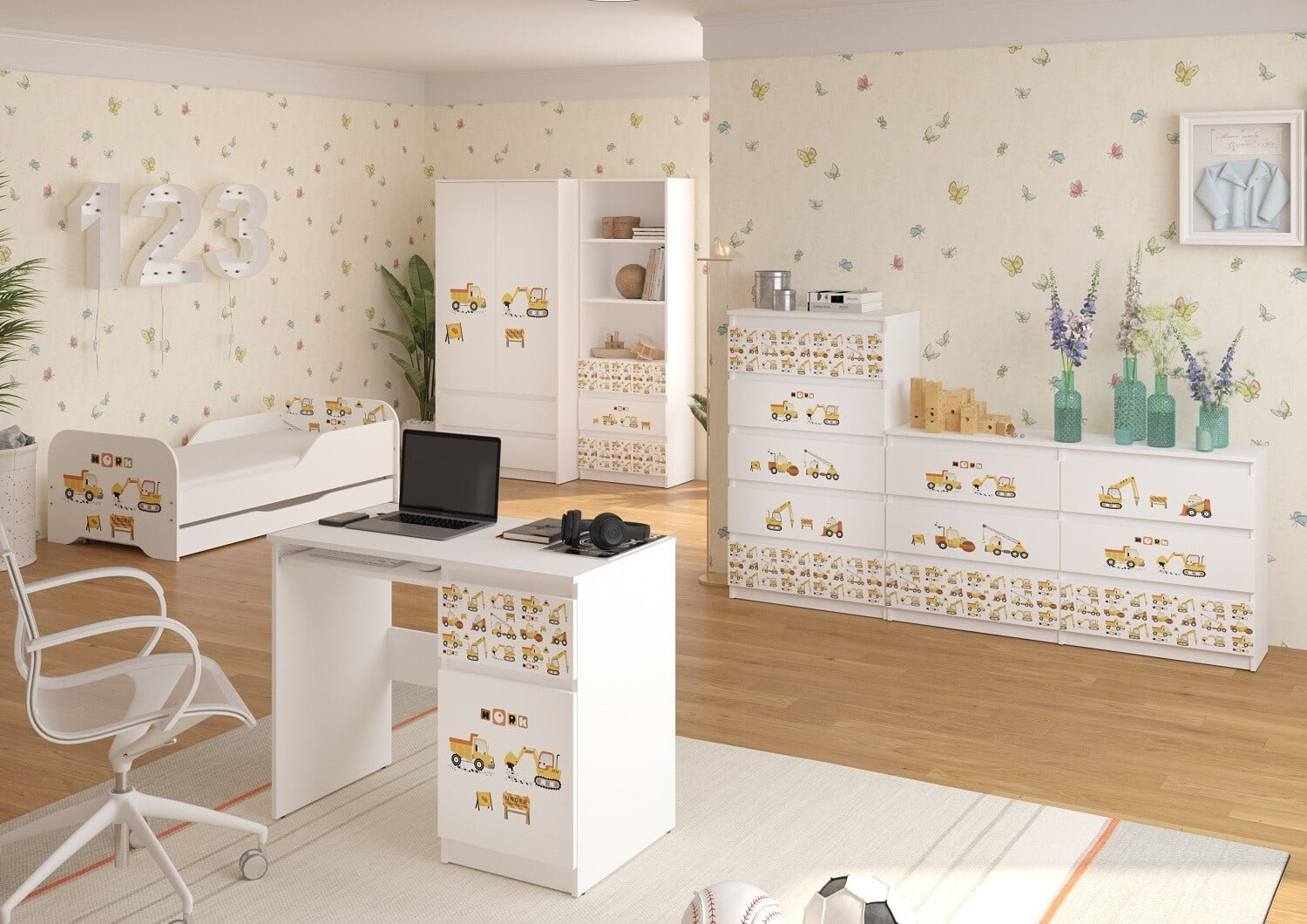 KOMODA 1 je praktičen in funkcionalen kos pohištva, ki bo našel svojo uporabo v vsaki otroški sobi. Ergonomske dimenzije zagotavljajo enostavno opremljanje sobe. Komoda je izdelana iz bele iverne plošče, zaključene s furnirjem. Sestavljena je iz petih predalov, nameščenih na vodilih, ki so opremljena z zaporami, ki preprečujejo, da bi se popolnoma izvlekli. Vrata komode imajo barvit potisk, čudovite žive barve in so ojačana s posebnim laminatom, ki preprečuje bledenje. DIMENZIJE