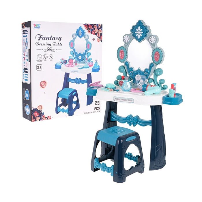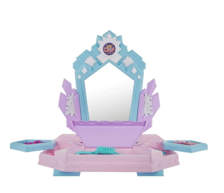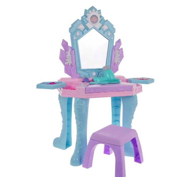 Interaktivna otroška toaletna mizica Elsa vsebuje številne dodatke, kot so sušilnik za lase, skozi katerega nežno teče zrak, zvok pa posnema pravi sušilnik za lase, čarobno ogledalo, v katerem se ob veselih melodijah pojavljajo pravljične princese, ponarejena kozmetika, nakit in še veliko več. 🙂