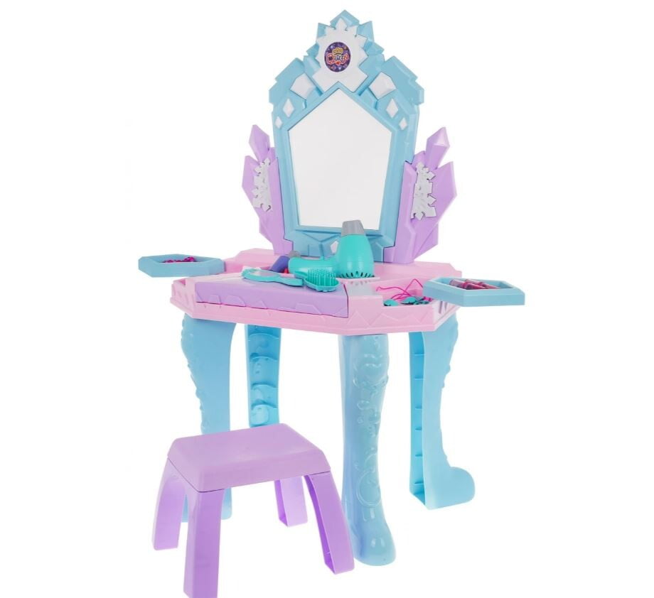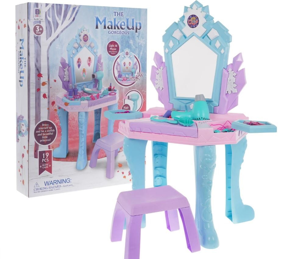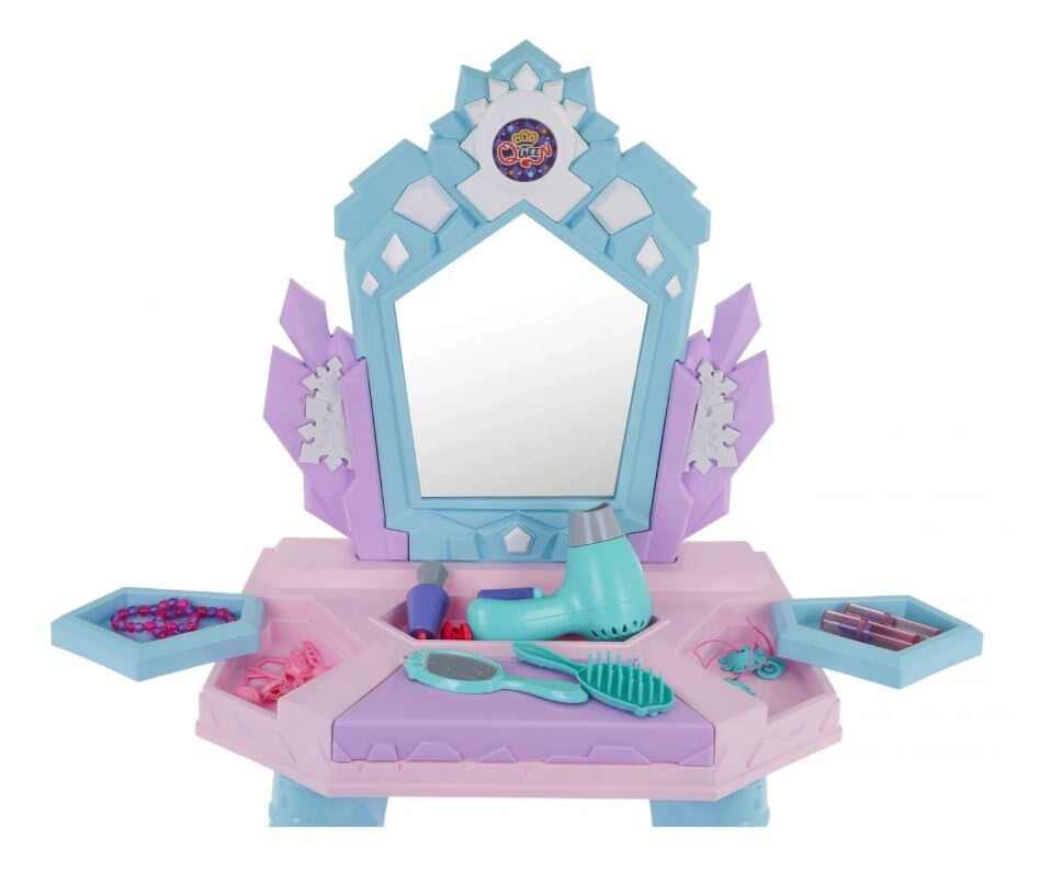 Interaktivna otroška toaletna mizica Elsa vsebuje številne dodatke, kot so sušilnik za lase, skozi katerega nežno teče zrak, zvok pa posnema pravi sušilnik za lase, čarobno ogledalo, v katerem se ob veselih melodijah pojavljajo pravljične princese, ponarejena kozmetika, nakit in še veliko več. 🙂
