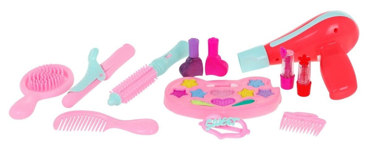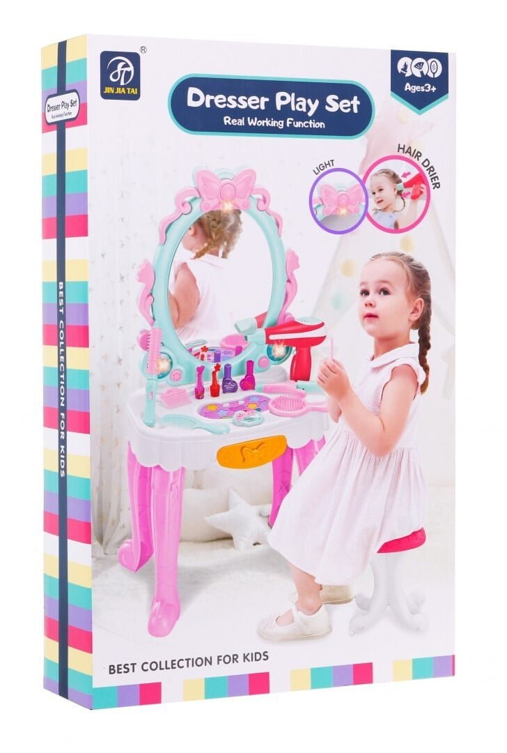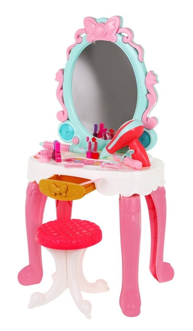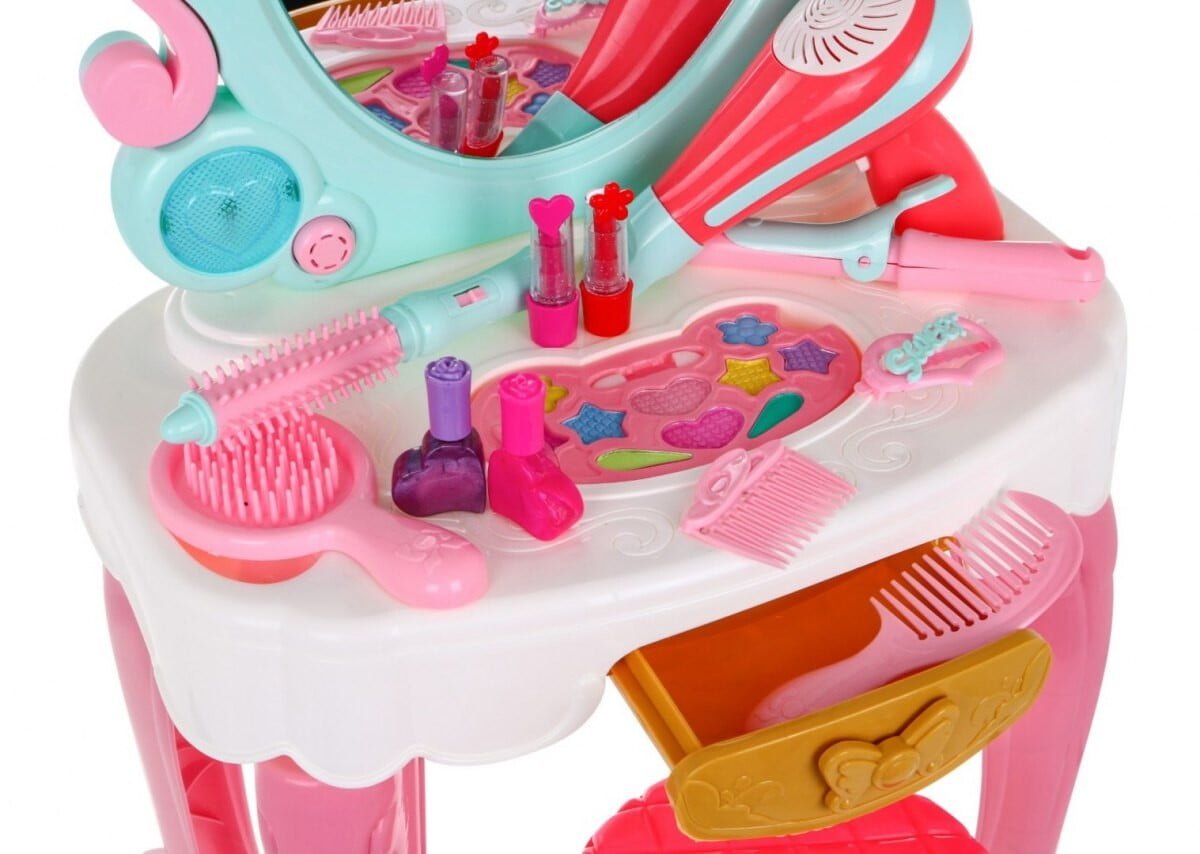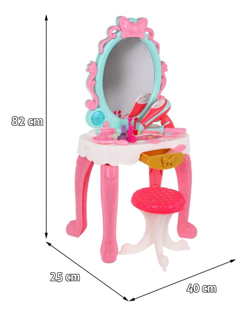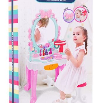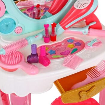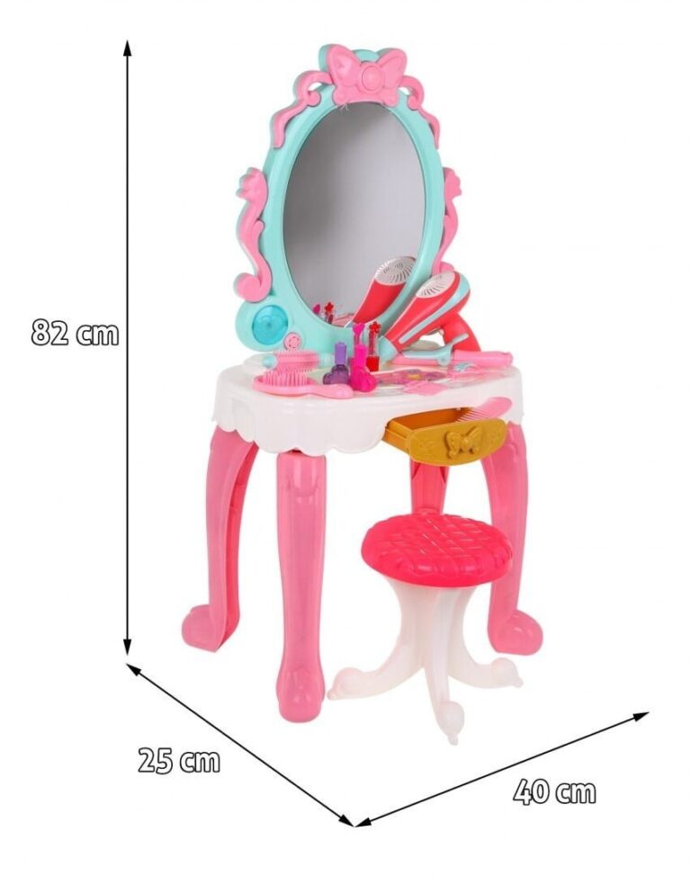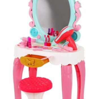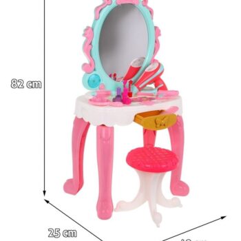 Bogato opremljena toaletna mizica z dodatki in stolčkom je predlog za majhne princeske od 3. leta starosti. Igrača ima zvočne in svetlobne učinke. Napaja jo 5 x AA baterij – niso priložene. Značilnosti kompleta: – osvetlitev na vrhu in ob straneh toaletne mizice, – tri glasbe v ozadju, – sušilnik za lase. – toaletna mizica z ogledalom – stol – 10 x senčila za oči – čopič za senčila za oči – sušilnik za lase – glavnik – krtača – likalnik – kodralnik las – 2 x sponka – 2 x šminka – 2 x lak za nohte Dimenzije: – toaletna mizica 82 cm x 40 cm x 25 cm – stol 23 cm x 26 cm – paket približno 60 cm x 37,5 cm x 12,5 cm. cleanupsale