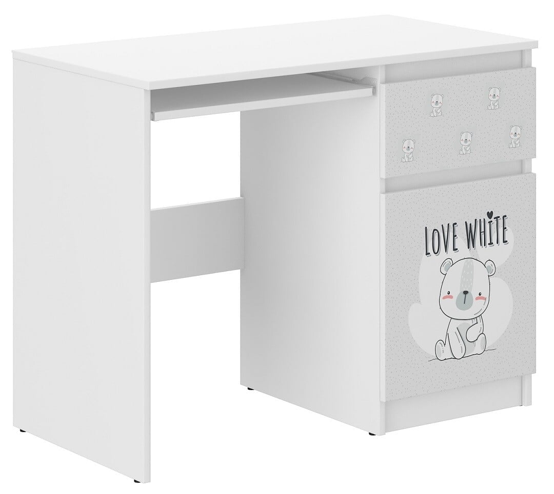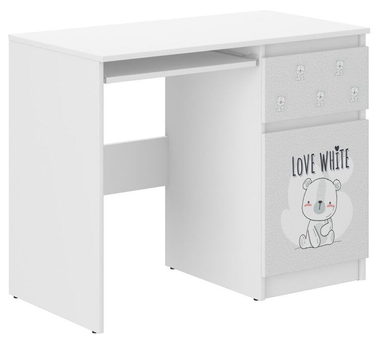 Otroška pisalna miza z izbiro različnih motivov. Sprednja stran predalov in polic je potiskana. Hrbtna stran omarice je bela. Robovi – obdelani z visokokakovostnim PVC materialom visoke mehanske in kemične odpornosti. Korpus in fronte – laminirana plošča Dimenzije: 76cm x 96cm x 50cm Dimenzije embalaže: 1020x540x110mm (1/1) Teža embalaže: 29 kg Država porekla: EU