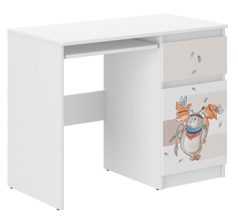Otroška pisalna miza z izbiro različnih motivov. Sprednja stran predalov in polic je potiskana. Hrbtna stran omarice je bela. Robovi – obdelani z visokokakovostnim PVC materialom visoke mehanske in kemične odpornosti. Korpus in fronte – laminirana plošča Dimenzije: 76cm x 96cm x 50cm Dimenzije embalaže: 1020x540x110mm (1/1) Teža embalaže: 29 kg Država porekla: EU