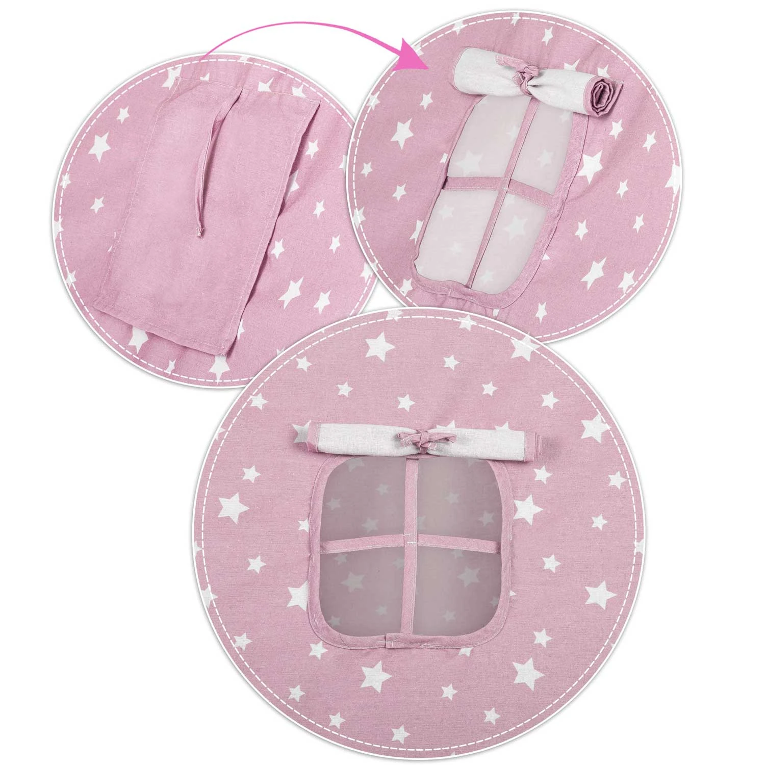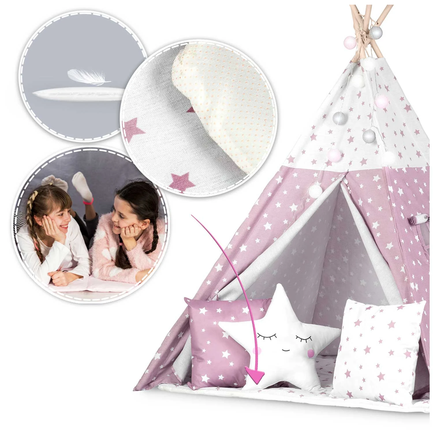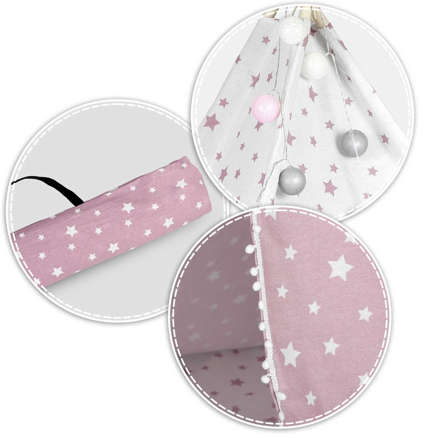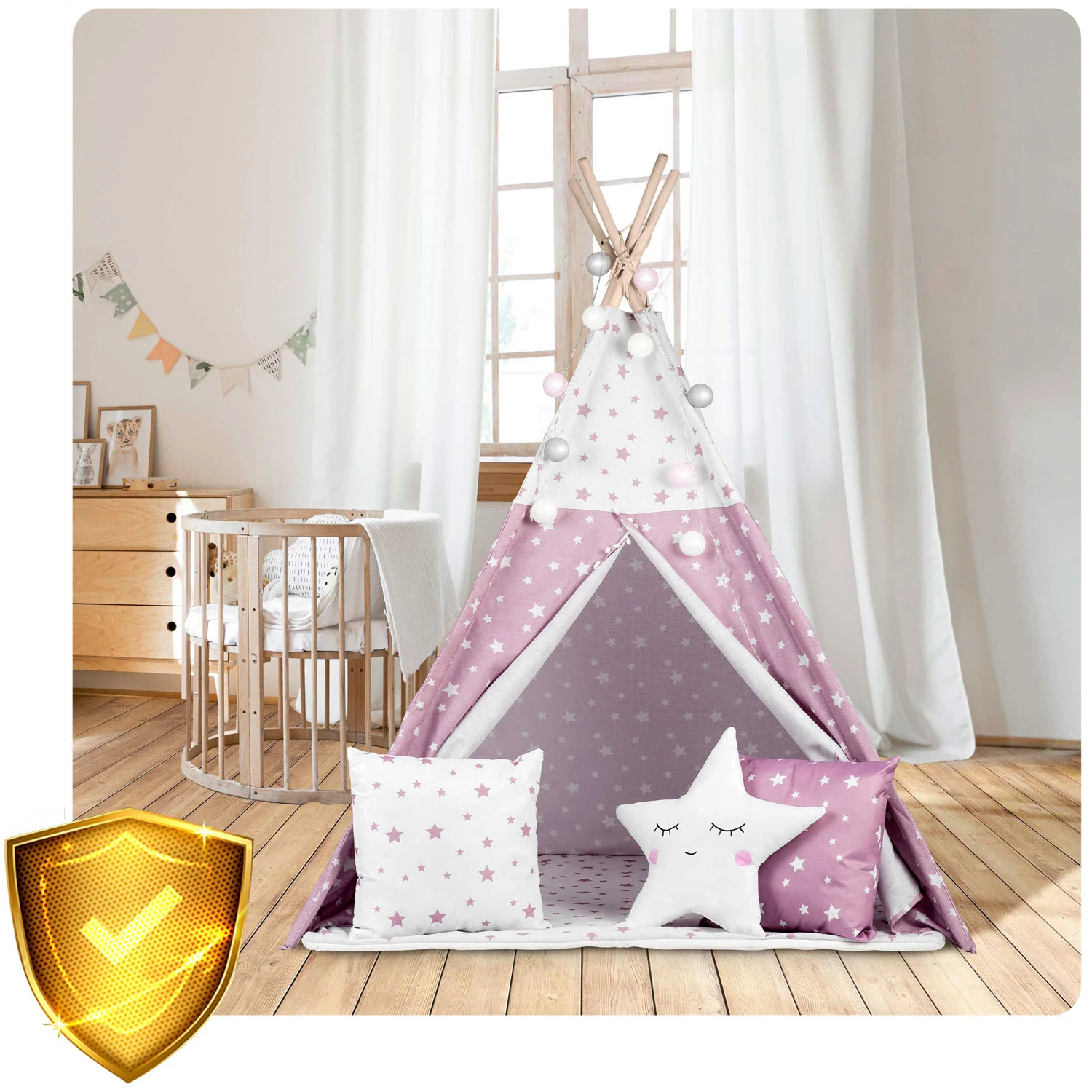 Otroški šotor tipi z lučkami Nukido – roza z zvezdicami Nukido Vsak poglavar potrebuje svoj tipi! Otroški šotor v obliki indijanskega tipija je HIT pri opremljanju otroških sob. Glavne značilnosti: naravni materiali – varni in zdravi, umirjene barve z modernimi vložki, Montessori stil, enostavno zlaganje in zavzame malo prostora, stabilna konstrukcija + BREZPLAČEN stabilizator, priložene tri blazine in izolacijska podloga, BREZPLAČNE lučke in odeja. 100 % naravno Pri otroških izdelkih se splača izbrati naravne materiale najvišje kakovosti. Zato je naš tipi izdelan iz vrhunskega bombaža. Bombaž je kot nalašč za otroške šotore, saj odlično diha. Visoka teža stene 175 g/m2 zagotavlja, da je tipi izjemno mehak, vzdržljiv in bo preživel največje otroške dogodivščine. Da bi bila zabava še bolj prijetna, smo vključili visokokakovostne bombažne blazine in izolacijsko podlogo s protizdrsnimi izboklinami. Zahvaljujoč mehkemu polnilu podloga ne le izolira, ampak zagotavlja tudi pravo udobje pri načrtovanju novih dogodivščin ali branju najljubših pravljic. Podloga bo popolna, če bo vaš mali vodja po napornem dnevu zaspal v vigvamu. Prilagodite podlogo potrebam vašega malčka! Podlogo je mogoče odstraniti, zato jo lahko enostavno uporabite kot podlogo. BREZPLAČNE lučke, prevleka in stabilizator! Vsak TIPI ima stabilizator, elegantne lučke in BREZPLAČNO prevleko za šotor! Vse to bo še bolj popestrilo videz naše baze in ji dalo še boljše vzdušje! Priložene so čudovito oblikovane blazine! Vsak TIPI ima komplet 3 blazin, vidnih na fotografiji! Sestavimo si svojo bazo! Komplet vsebuje: okvir – 4 lesene stebre + stabilizator, lučke na baterije – baterije niso priložene, žaluzije, okno, nežno in zračno tkanino, zaščitno podlogo, 3 debele blazine, drsne stene, fascikel. Odpiranje okna – še več zabave! Samo enkrat ga sestavite in je pripravljen. Zlaganje in razstavljanje traja le trenutek. Šotor je mogoče enostavno premikati, ko je zložen. Lahko ga postavite v skupni prostor kot igralo ali na vrt za zaščito pred vročim soncem. Tehnični podatki: dimenzije šotora: 120 x 120 x 165 cm, dimenzije palice: ø2,2 x 190 cm, blazine: 3 kosi, teža bombaža: 175 g/m2, material palice: bor.